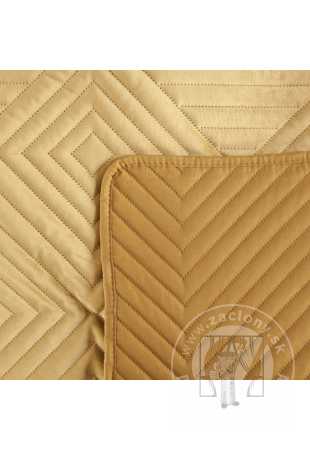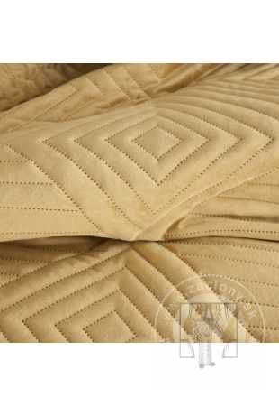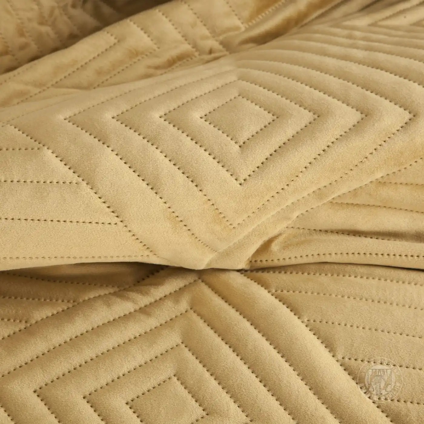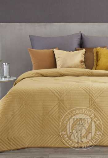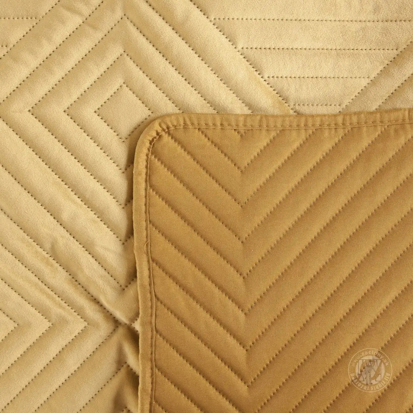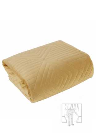 Luxusný prehoz na posteľ v medovožltej farbe s minimalistickým geometrickým vzorom. Vrchná časť prehozu je vyrobená z mäkkej zamatovej látky s jemným leskom, zatiaľ čo spodná časť je vyrobená z hladkej látky - matného mikrovlákna, ktoré zabraňuje skĺznutiu prehozu z posteľnej bielizne. Spodná aj vrchná časť sú prešívané bezšvíkovou metódou horúceho lisu v geometrickom vzore. Prešívanie horúcim lisom zvyšuje pevnosť materiálu a zaisťuje odolnosť výrobku. Okraj prehozu je zakončený estetickým lemovaním.