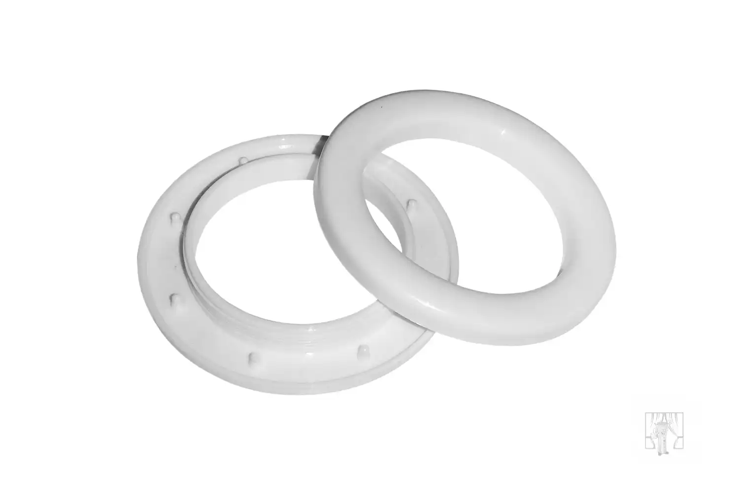 Plastový krúžok na záves so zacvakávacím mechanizmom, jednoduché nasadenie, pevné držanie, vhodný na tyče a garniže.