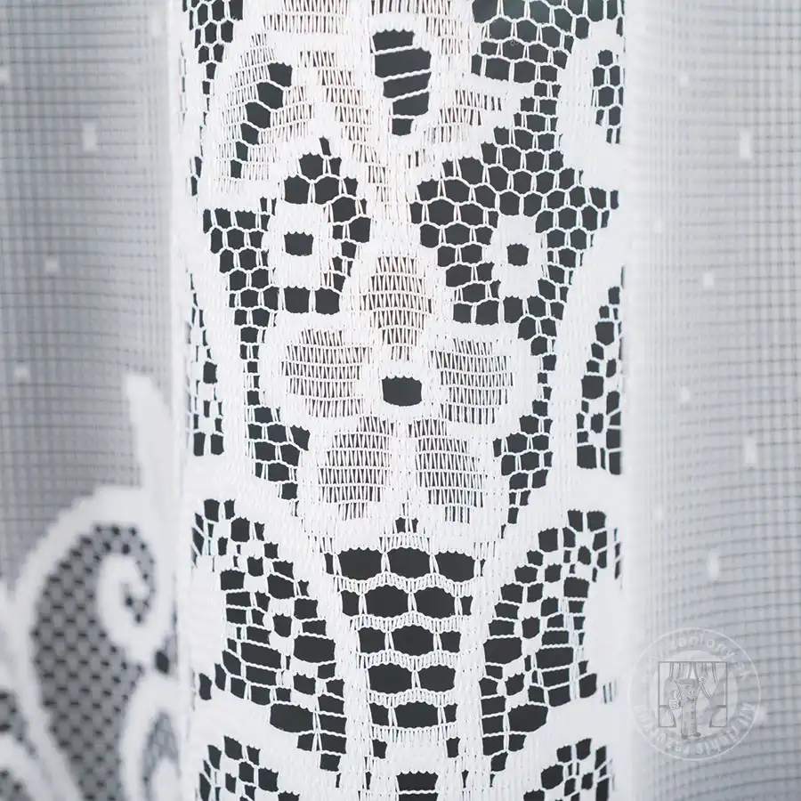 Oblúková záclona s elegantným vzorom sa hodí do klasických interiérov.