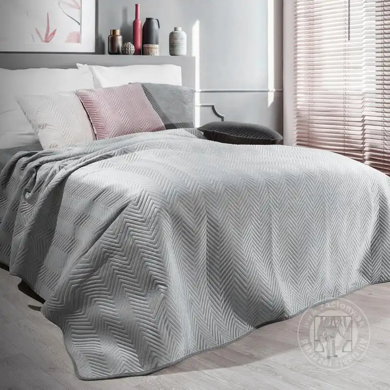 Spodná aj vrchná strana sú prešívané bezšvíkovou metódou lisovania za tepla (hot press) v geometrickom vzore rybej kosti. Prešívanie hot press zvyšuje pevnosť materiálu a zaisťuje trvanlivosť produktu. Nadýchaná výplň medzi vrstvami materiálu robí prehoz pružným, vďaka čomu sa prehoz pekne prispôsobí posteli. Okraj prehozu je ukončený estetickým lemovaním.