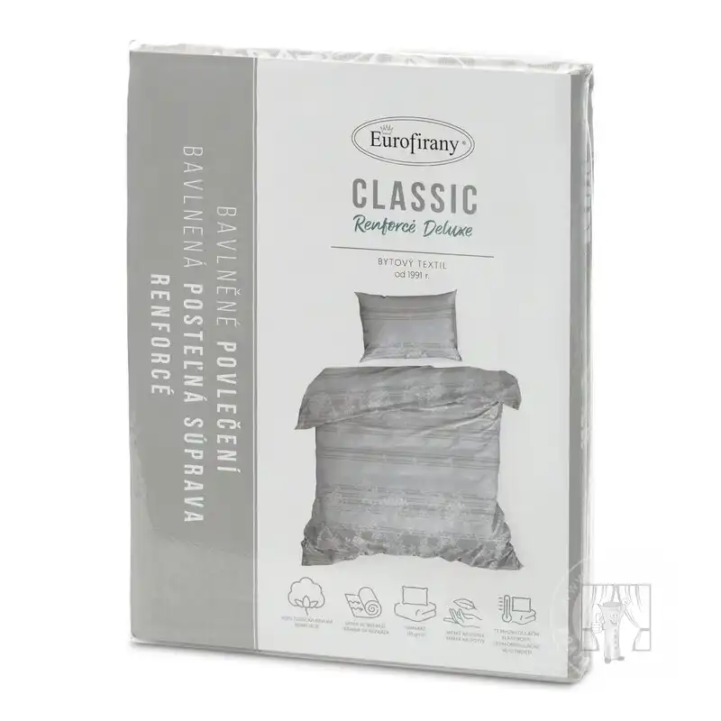 Posteľná bielizeň je ušitá s maximálnym dôrazom na detail. Kolekcia CLASSIC RENFORCE DELUXE sa vyznačuje módnymi potlačami vyrobenými modernou metódou super jemnej pigmentovej tlače, vďaka ktorej sú vzory trvácne a farby nestrácajú na intenzite ani po mnohých praniach.