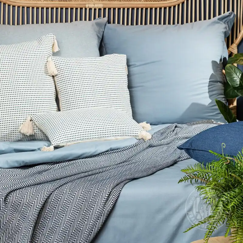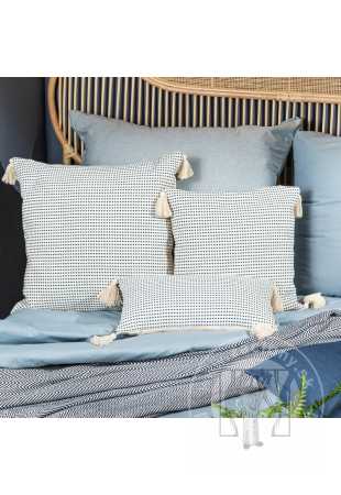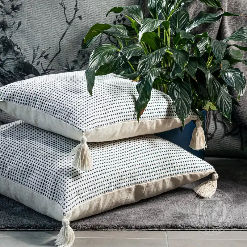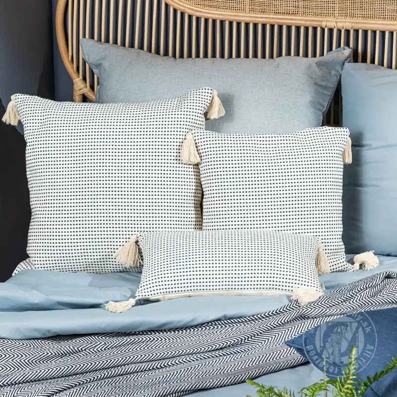 Obliečka na vankúš utkaná z hrubých bavlnených nití v jemnom žakárovom vzore je jedinečnou dekoráciou, ktorá do interiéru vnesie pokoj a sviežosť. Ozdobné strapce na rohoch obliečky na vankúš ju robia mimoriadne elegantnou. Doplnky v tlmených farbách v ekologickom štýle sú ideálne do módnych moderných interiérov, môžu zdobiť spálňu a uplatnia sa aj na terase alebo balkóne.