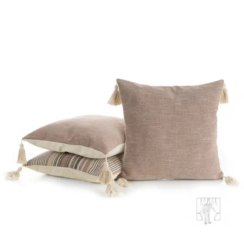 Táto dekoračná obliečka na vankúš s ozdobnými strapcami v rohoch dodá každému interiéru nádych šarmu. Zips všitý na jednej strane obliečky uľahčuje zmenu dekorácie. Táto látka v ekologickom štýle sa hodí aj do interiérov v boho štýle. Táto obojstranná obliečka na vankúš má na jednej strane pruhovaný vzor a na druhej strane jje jednofarebná.