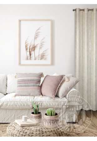 Dekoračná obliečka na vankúš s ozdobnými strapcami zdobiacimi jej rohy je dekoráciou, ktorá dodá vášmu interiéru nevšedný šarm. Zips všitý do jednej zo strán obliečky na vankúš umožňuje jednoduchú výmenu dekorácie počas chvíľky. Látka v ekologickom štýle vyzerá skvele v interiéroch v prírodnom štýle a je ideálna aj do interiérov v štýle boho. Obojstranná obliečka na vankúš má na jednej strane pruhovaný vzor a na druhej strane jednofarebnú púdrovú látku.