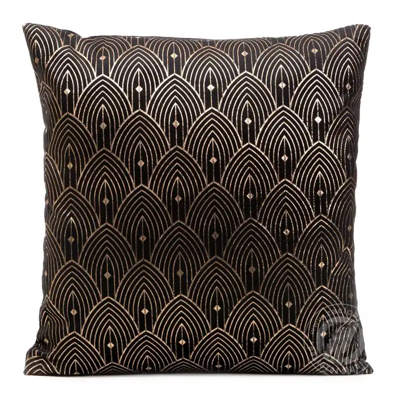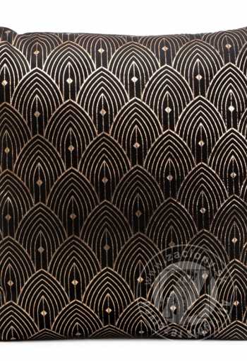 Luxusná čierna obliečka na vankúš sa vyznačuje originálnym dizajnom inšpirovaným štýlom Art Deco. Zlatá potlač na mäkkom zamate dokonale doplní moderný aj dobový interiér. Praktický zips všitý na jednej strane umožňuje jednoduchú zmenu dekorácie.