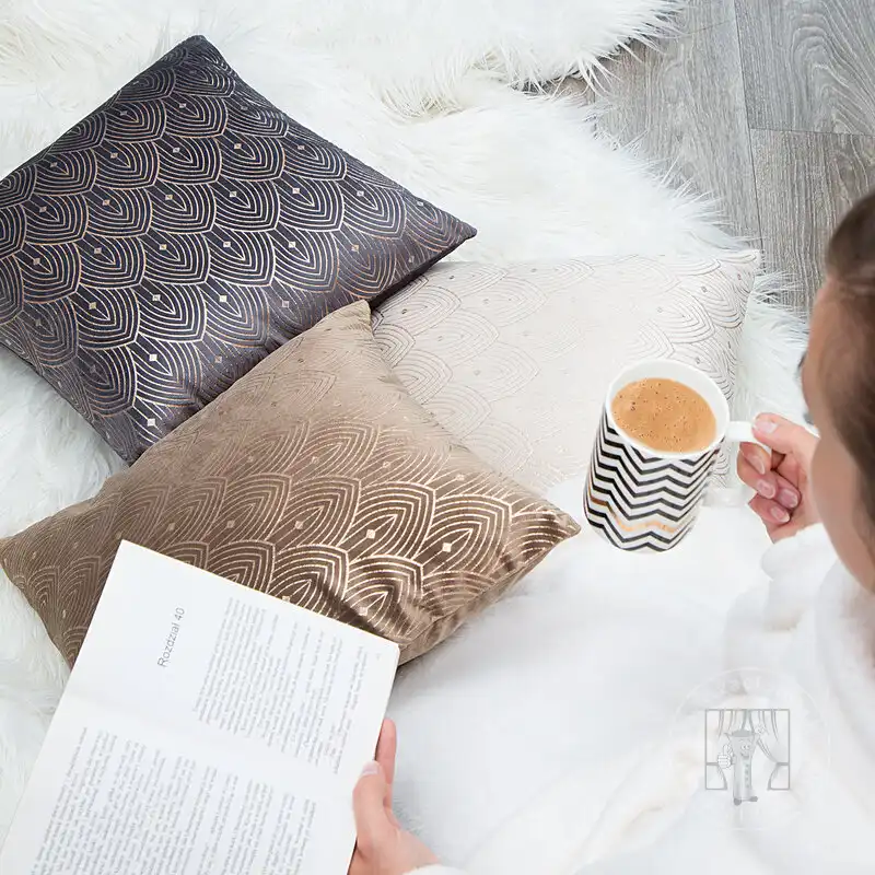 Obliečka na vankúš sa vyznačuje moderným dizajnom; zlatá potlač na mäkkom zamate sa dokonale hodí do moderných interiérov. Dekoračné obliečky na vankúš poskytnú oporu pri chvíľkach relaxu, budú tiež vynikajúcou dekoráciou na pohovke v obývačke alebo spálni. Vďaka praktickému zipsu všitému na jednej z jeho strán trvá výmena dekorácie len krátku chvíľu.