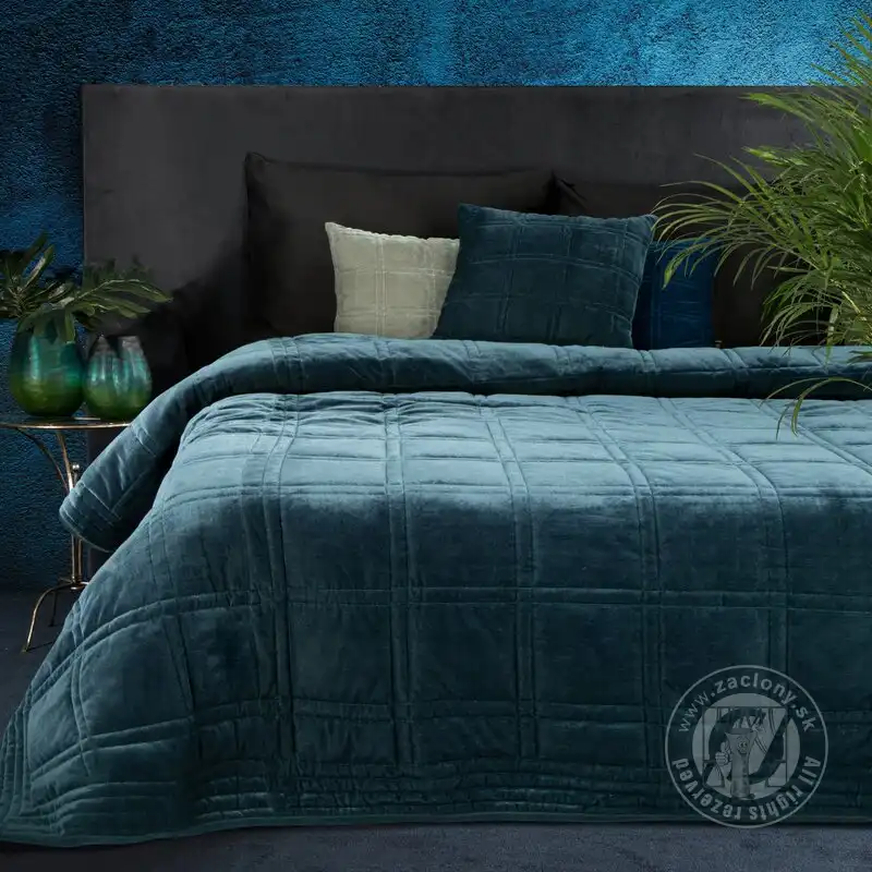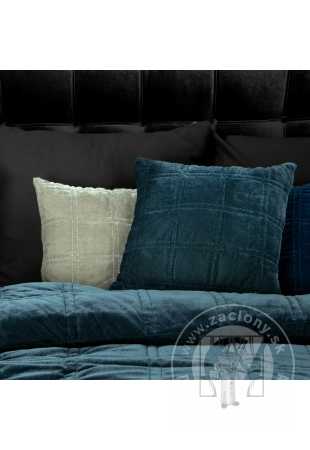Tmavomodrá exkluzívna obliečka na vankúš je vyrobená z mäkkej a jemnej zamatovej látky s jemným leskom, ktorú zdobí dvojito prešívaný geometrický motív v kockovanom vzore. Zips všitý na jednej strane umožňuje rýchlu a jednoduchú výmenu poťahu.