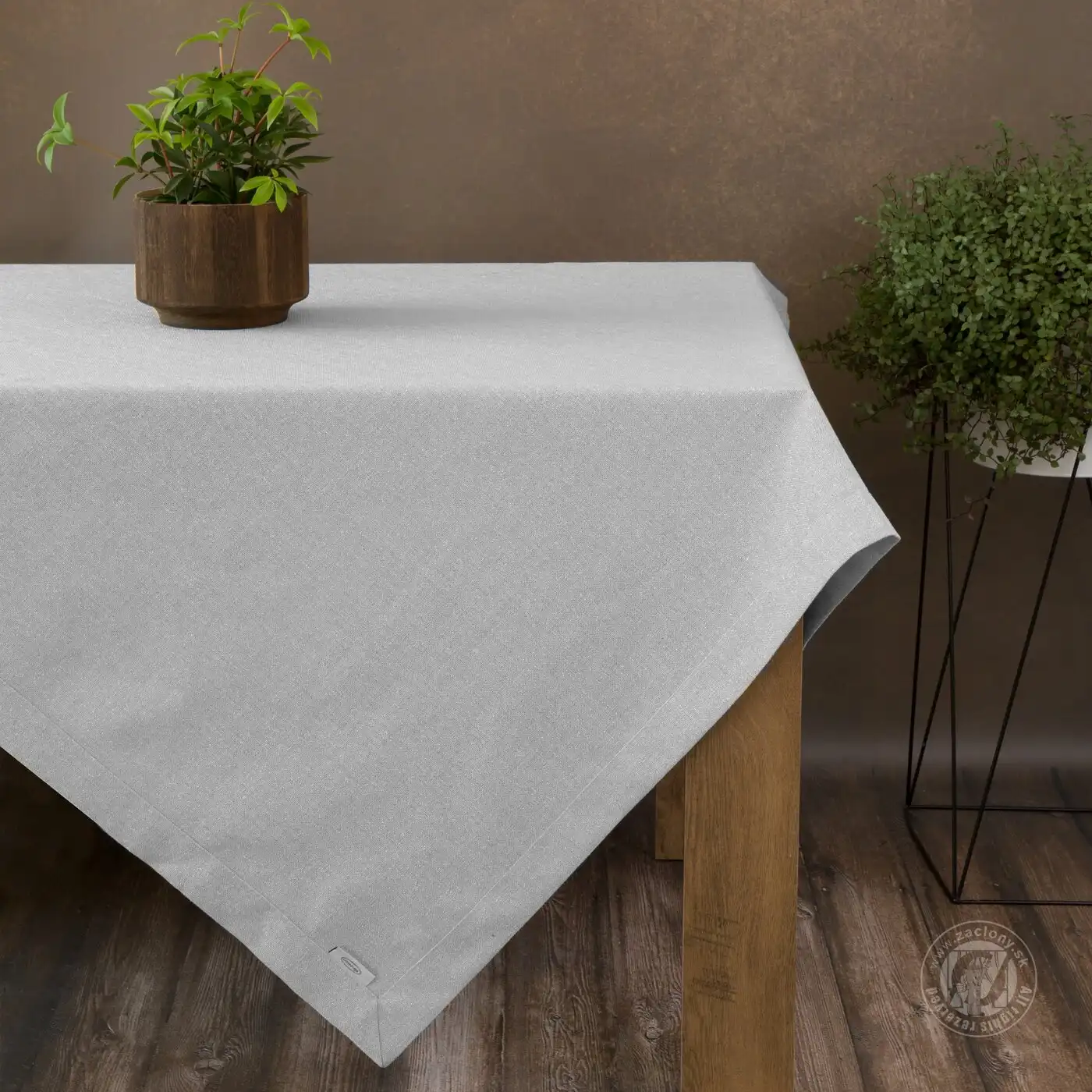 Elegantné prestretie stola urobí každú oslavu výnimočnou a dlhotrvajúcou. Obrus v svetlosivej farbe sa vyznačuje tkaninou pripomínajúcou plátno a efektným lemom. Látka je pretkaná striebornou niťou, ktorá dodáva nádych elegancie.