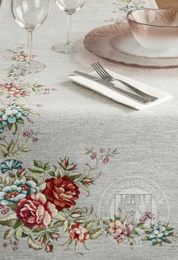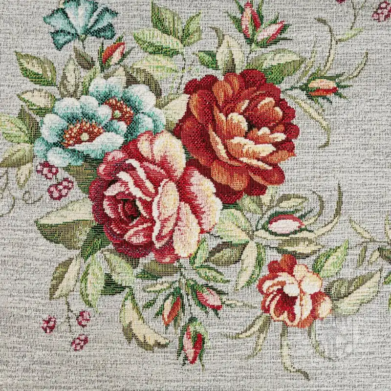 Obrus vyrobený z hrubej gobelínovej látky s mäkkou ženilkovou niťou a zdobený kvetinovým vzorom je dekoráciou pripomínajúcou retro štýl. Hrubšia žakárová látka zaručuje krásny dekoratívny efekt a vzor získaný technikou tkania dodáva obrusu krásny vzhľad v rustikálnom aj romantickom interiéri. Vysokokvalitná látka, ktorá je zmesou polyesterových, akrylových a bavlnených vlákien, sa ľahko udržiava a nekrčí sa. Starostlivé spracovanie zaručuje spokojnosť s výrobkom a motív kvitnúcich kvetov dokonale oživuje interiér, vnáša do aranžmánu sviežosť a pozitívnu náladu.