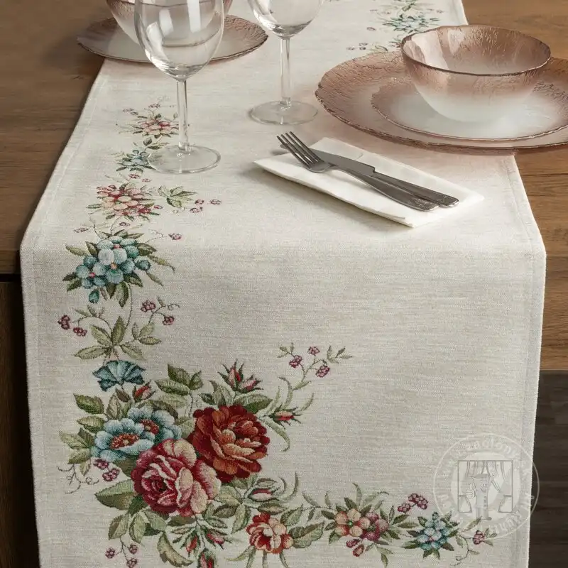 Behúň navrhnutý z hrubej gobelínovej tkaniny s mäkkou ženilkovou niťou a zdobený kvetinovým vzorom je dekoráciou pripomínajúcou vintage štýl. Hrubšia žakárová tkanina zaručuje krásny efekt a vzor dosiahnutý technikou tkania spôsobuje, že obrus vyzerá krásne v interiéri v rustikálnom štýle aj v romantickej štylizácii.