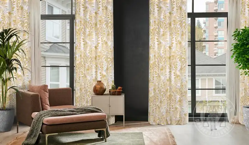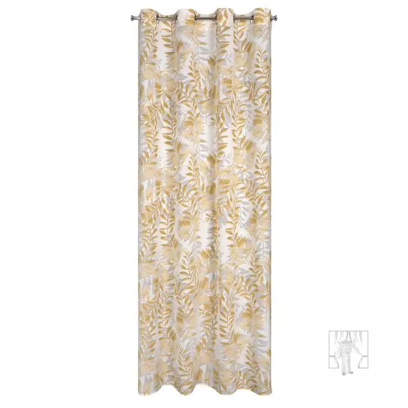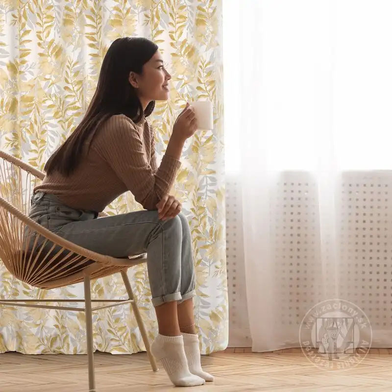 Záves z jemnej polopriehľadnej tkaniny je zdobený jemným motívom vetvičiek, ktoré vytvárajú nezvyčajný trojrozmerný efekt. Farebná potlač sa prelína so žakárovým vzorom, vďaka čomu je záves dynamický a výnimočný.