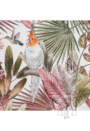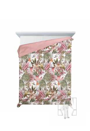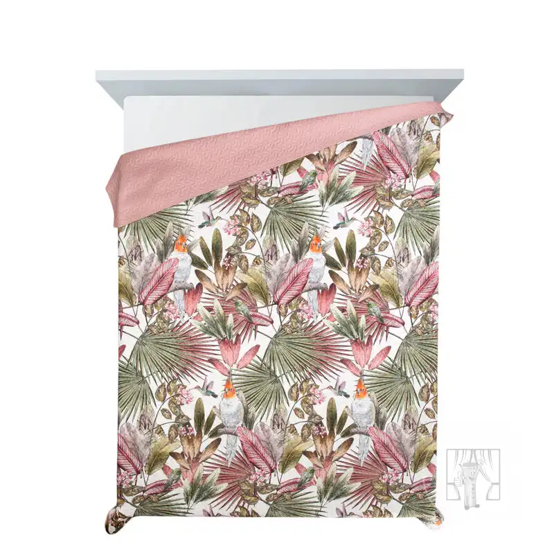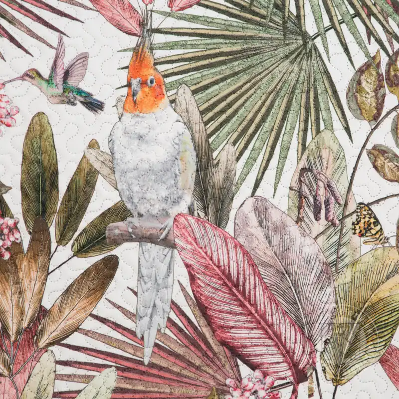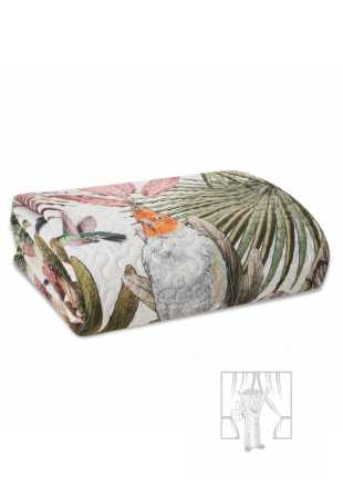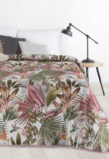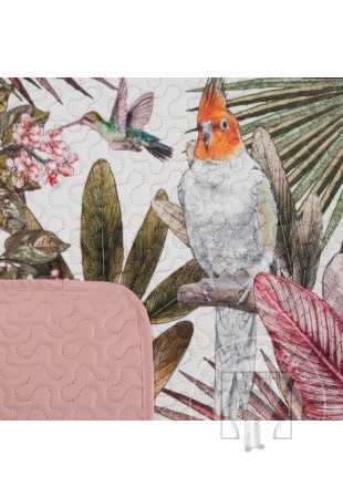 Prehoz PARROT so vzorom exotických rastlín a papagájov vnesie do Vášho interiéru letnú sviežosť! Druhá strana je navrhnutá v jemnom odtieni púdrovo ružovej farby.Vďaka vrstve elastickej výplne sa prehoz prirodzene obopína okolo postele. Moderná metóda bezšvového prešívania (hotpress) zvyšuje pevnosť látky, čím zabezpečuje dlhšiu životnosť.