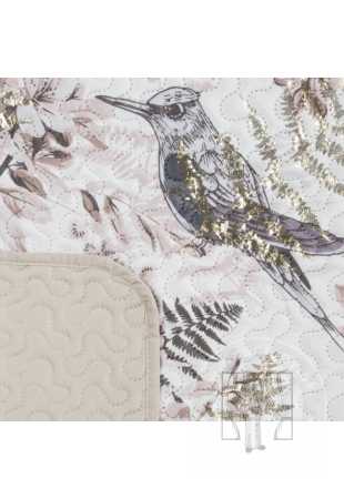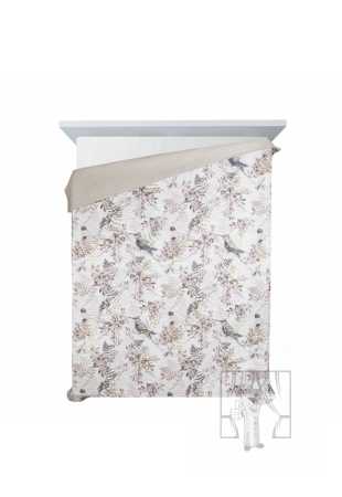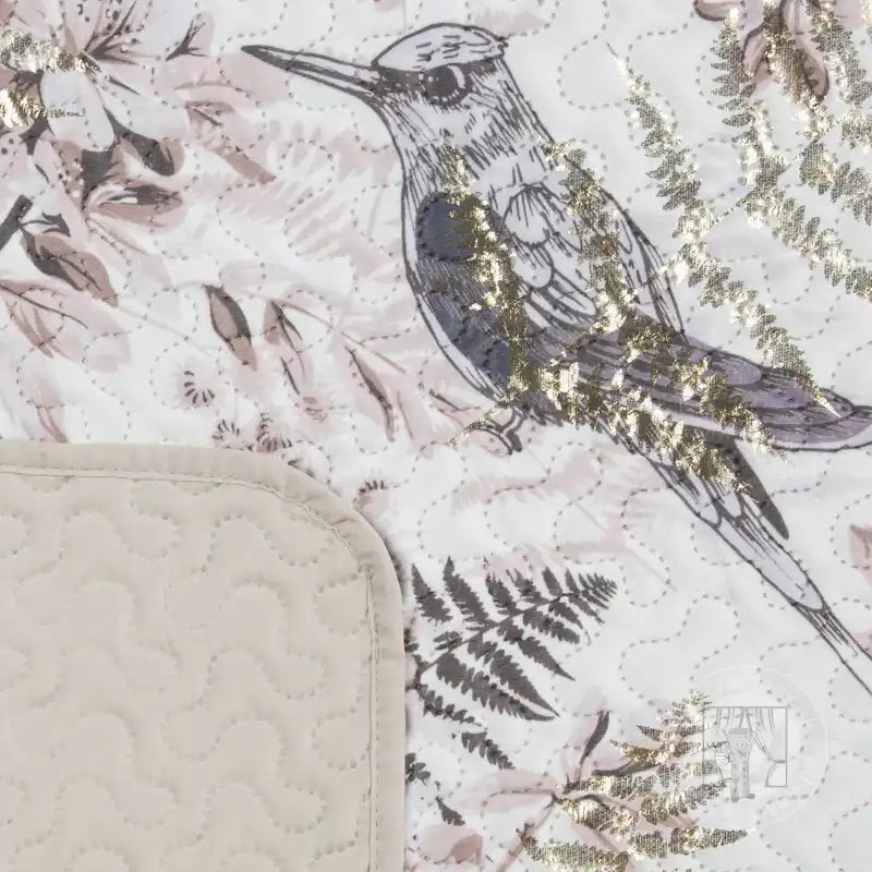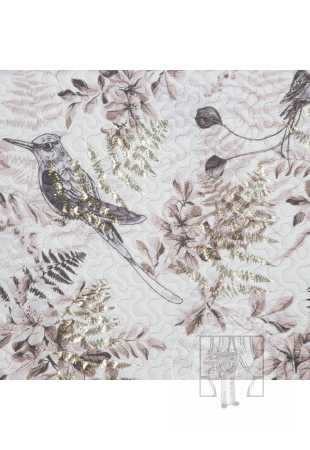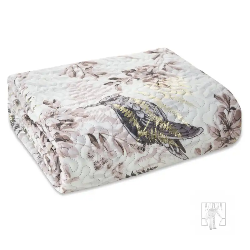 Prehoz POLY z mäkkej velúrovej tkaniny, zdobený letným vzorom vtáčikov a vetvičiek dodá interiéru vašej spálne svieži letný nádych. Druhá strana prehozu má hladký sivobéžový odtieň a je vyrobená z mikrovlákna, takže prehoz sa nepohybuje a vždy ostane na svojom mieste. Jemna púdrovo sivá potlač je zvýraznená zlatými odleskami v podobe listov papradia.