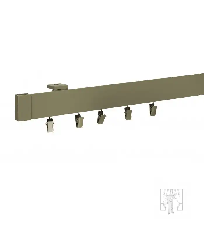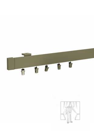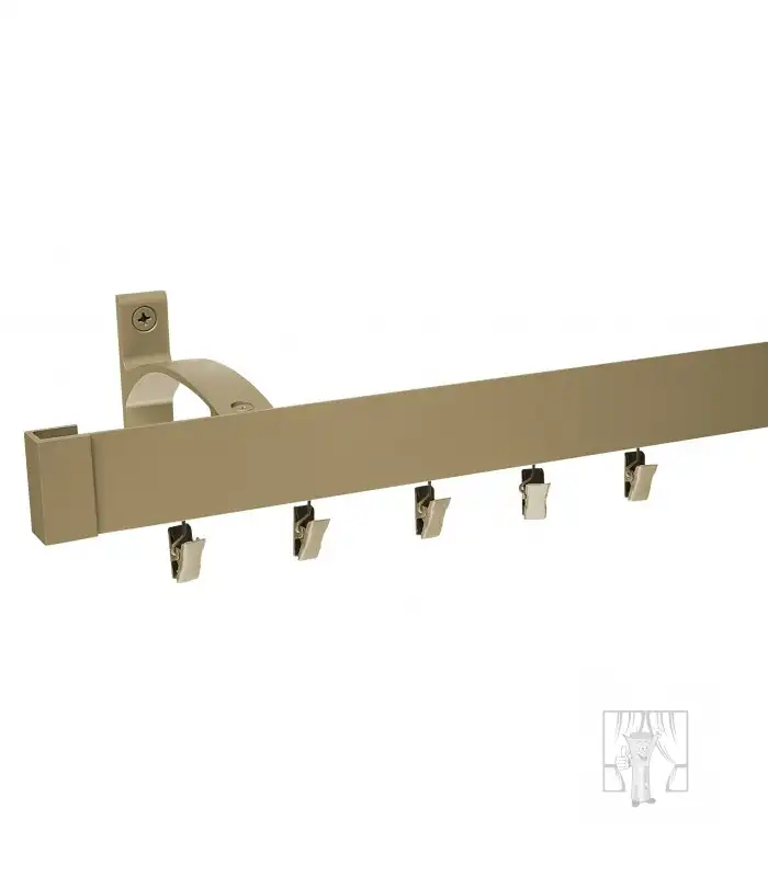 Exkluzívna celokovová garniža s vysokokvalitnou úpravou. Tyč - typu koľajnice, vo vnútri ktorej sa pohybujú háčiky alebo štipce.