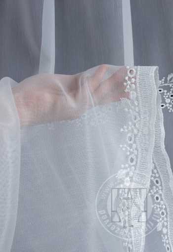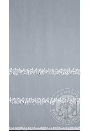 Krátka matná záclona zdobená jemnou elegantnou výšivkou v troch radoch.