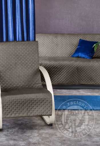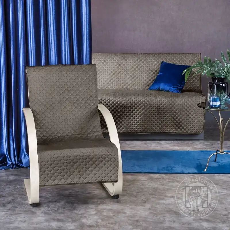 Vrch prehozu je vyrobený z hebkej zamatovej látky s jemným leskom, spodná strana je vyrobené z hladkej látky-matného mikrovlákna, ktoré zabraňuje zošmyknutiu prehozu z kresla.