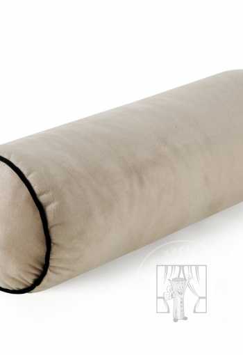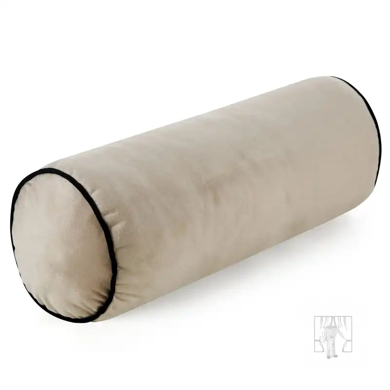 Elegantný béžový vankúš s výplňou v tvare valca je vyrobený z mäkkej zamatovej tkaniny. Vankúš je zdobený elegantným lemovaním v kontrastnej farbe, ktoré zdôrazňuje jeho jedinečný charakter a dodáva mu rafinovaný štýl.