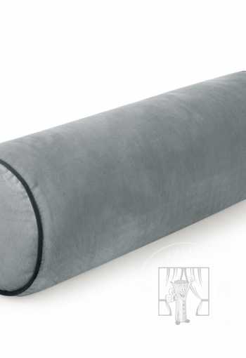 Elegantný strieborný vankúš s výplňou v tvare valca je vyrobený z mäkkej zamatovej tkaniny. Vankúš je zdobený elegantným lemovaním v kontrastnej farbe, ktoré zdôrazňuje jeho jedinečný charakter a dodáva mu rafinovaný štýl.