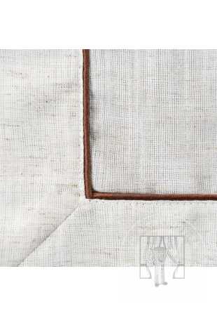 Obrus NATURA z tkaniny s prímesou ľanu je minimalistickou dekoráciou stola. Obrus v prírodnej farbe je zvýraznený dvojitým lemovaním a tmavšou hnedou lemovkou, ktorá vedie po všetkých štyroch okrajoch obrusu.