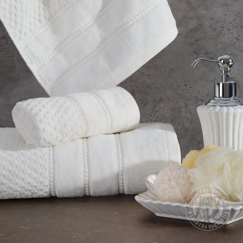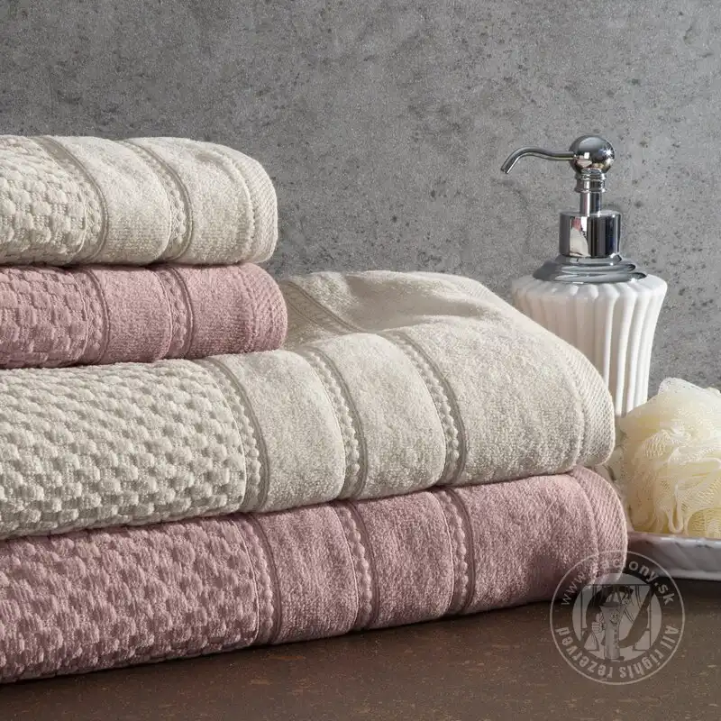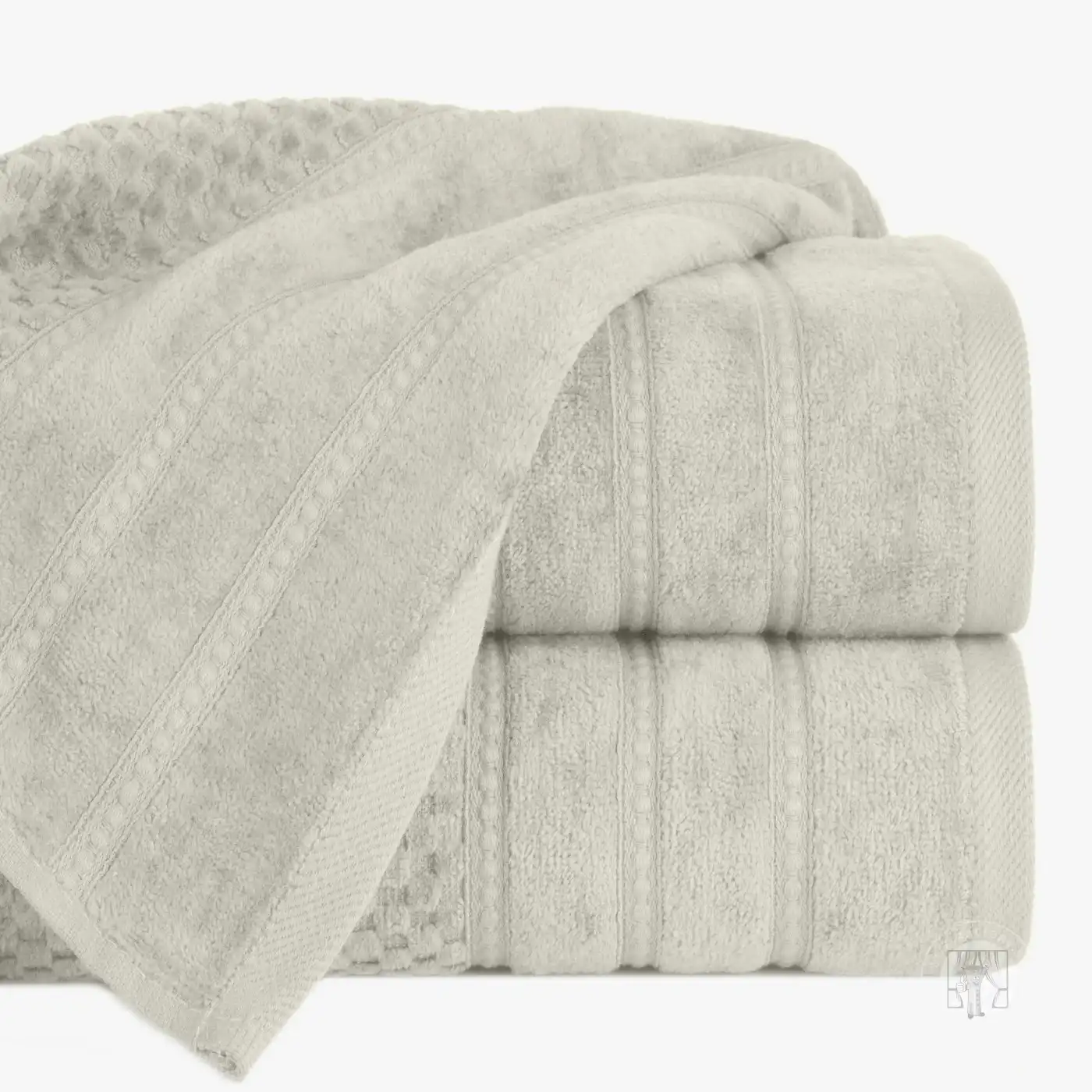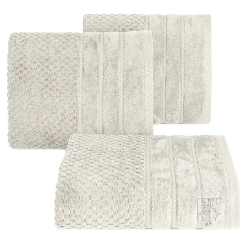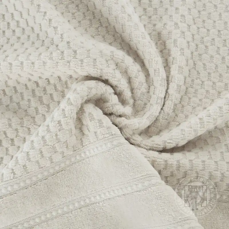 Štýlový bavlnený uterák so štruktúrou, ktorý spája funkčnosť s eleganciou. Je vyrobený z mäkkej a kvalitnej bavlny a vyznačuje sa výnimočnou savosťou a odolnosťou. Jemný vyvýšený mriežkový vzor dodáva uteráku príjemnú štruktúru a zároveň zvyšuje jeho schopnosť rýchlo absorbovať vodu. Spodnú časť uteráka zdobí široký okraj ukončený jemným prešívaním.