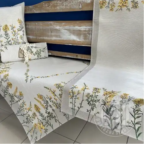 Gobelínové prestieranie na stôl s motívom lúčnych kvetov. Hrubšia tkanina zaručuje krásny efekt a vzor dosiahnutý technikou tkania spôsobuje, že prestieranie vyzerá krásne v interiéri v rustikálnom štýle aj v romantickej štylizácii.