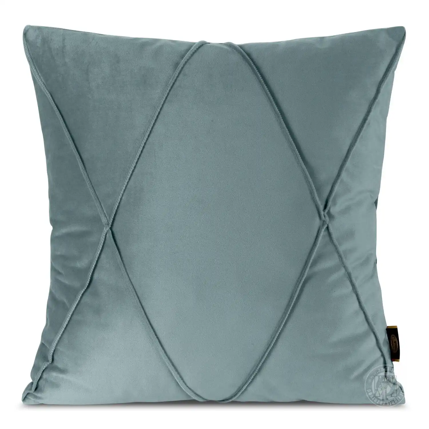 Elegantná svetlomodrá obliečka na vankúš vyrobená zo zamatovej látky. Obliečka je zdobená elegantným prešitím. Geometrické tvary dodávajú obliečke na vankúš moderný charakter, ktorý dokonale dopĺňa zamatovú textúru látky.