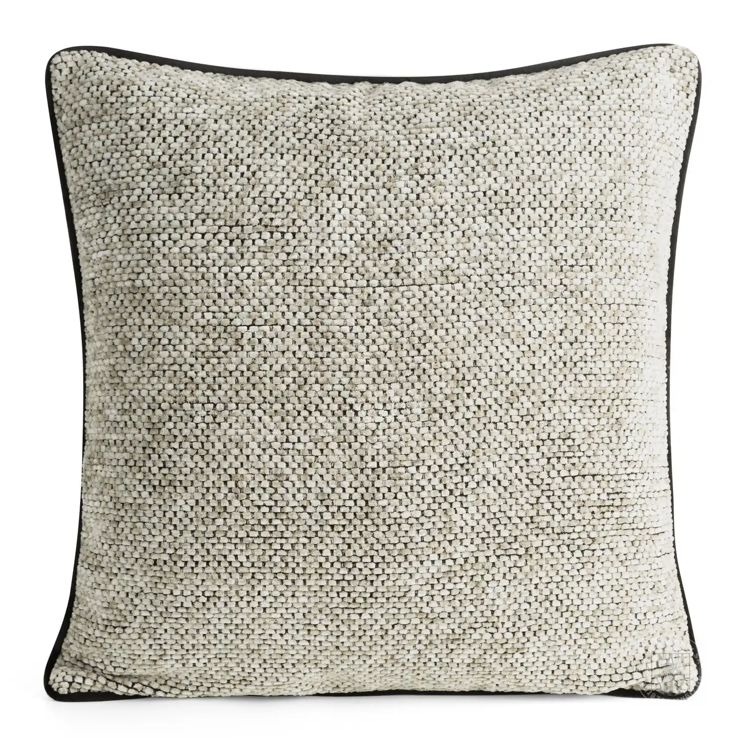 Elegantná béžová obliečka na vankúš vyrobená z pletenej ženilkovej nite. Obliečka je zdobená elegantným lemovaním. Unikátna textúra materiálu jej dodáva výrazný vzhľad, zatiaľ čo mäkký zamatový chrbát poskytuje pohodlie a jemný kontrast. Obliečka na vankúš má tiež skrytý zips.