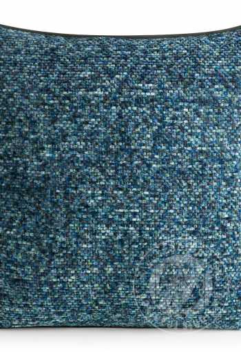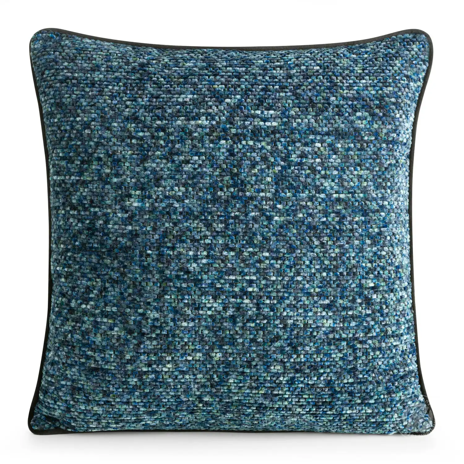 Elegantná modrá obliečka na vankúš vyrobená z pletenej ženilkovej nite. Obliečka je zdobená elegantným lemovaním. Unikátna textúra materiálu jej dodáva výrazný vzhľad, zatiaľ čo mäkký zamatový chrbát poskytuje pohodlie a jemný kontrast. Obliečka na vankúš má tiež skrytý zips.