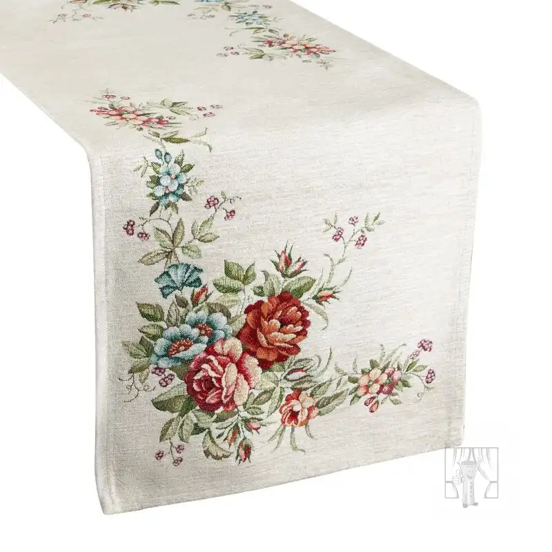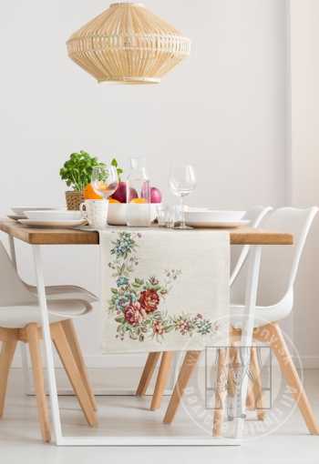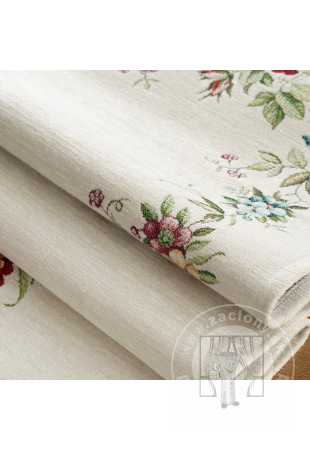 Behúň navrhnutý z hrubej gobelínovej tkaniny s mäkkou ženilkovou niťou a zdobený kvetinovým vzorom je dekoráciou pripomínajúcou vintage štýl. Hrubšia žakárová tkanina zaručuje krásny efekt a vzor dosiahnutý technikou tkania spôsobuje, že obrus vyzerá krásne v interiéri v rustikálnom štýle aj v romantickej štylizácii.