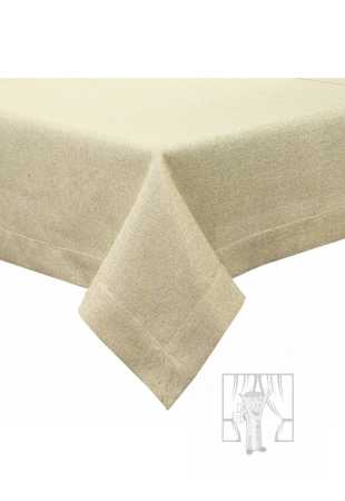 Elegantné prestretie stola urobí každú oslavu výnimočnou a dlhotrvajúcou. Obrus v béžovej farbe sa vyznačuje tkaninou pripomínajúcou plátno a efektným lemom. Látka je pretkaná zlatou niťou, ktorá dodáva nádych elegancie a luxusu.