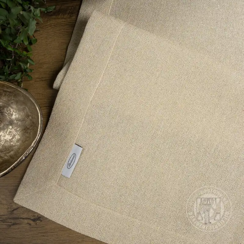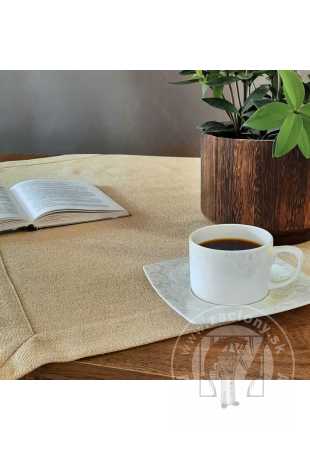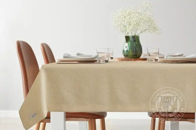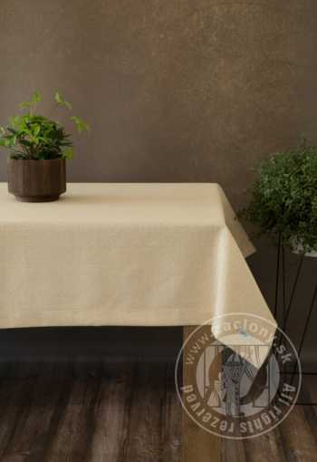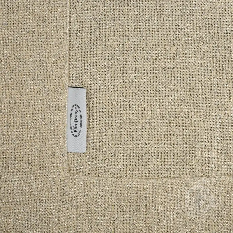 Elegantné prestretie stola urobí každú oslavu výnimočnou a dlhotrvajúcou. Obrus v béžovej farbe sa vyznačuje tkaninou pripomínajúcou plátno a efektným lemom. Látka je pretkaná zlatou niťou, ktorá dodáva nádych elegancie a luxusu.