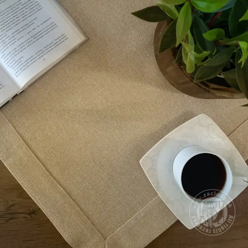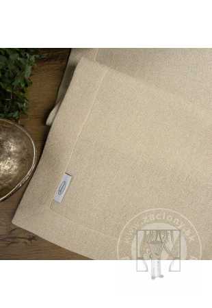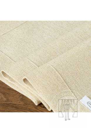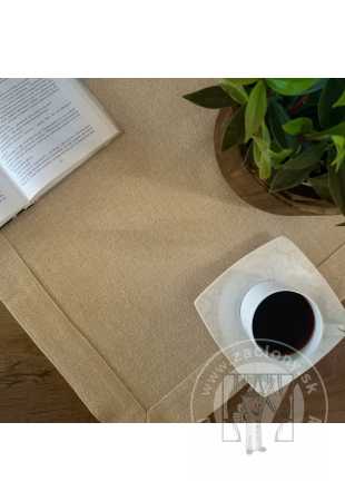 Béžový obrus sa vyznačuje efektným pásikom materiálu, ktorý zvýrazňuje jeho okraje. Neoceniteľnou výhodou materiálu, z ktorého je dekorácia vyrobená, je lesklá zlatá niť, ktorá mu dodáva elegantný vzhľad. Mimoriadne vkusný, no zároveň jednoduchý tvar obrusu dokonale ozdobí stôl a vytvorí slávnostnú atmosféru pri spoločnom stolovaní.
