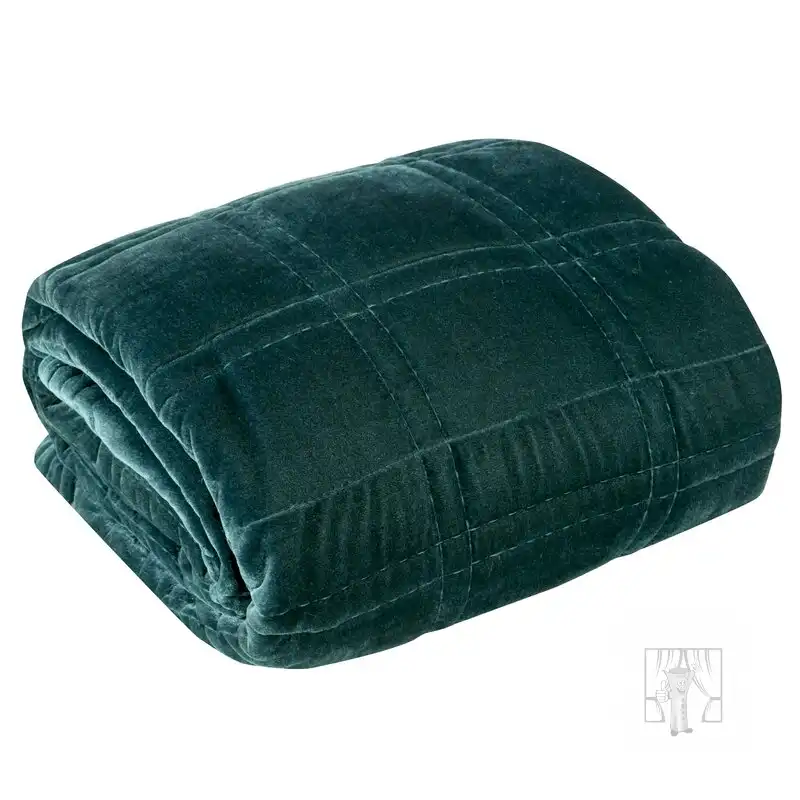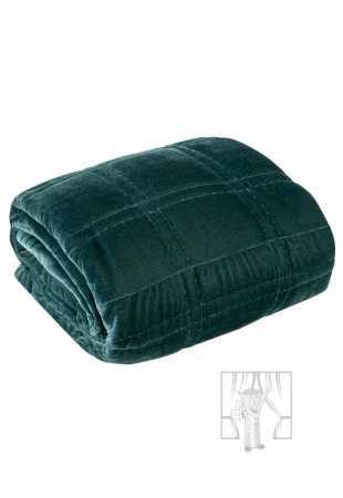 Exkluzívny prehoz na posteľ z mäkkej a na dotyk príjemnej zamatovej tkaniny s jemným leskom, s dvojito prešitým geometrickým károvaným vzorom. Vrchná strana prehozu je z nadýchaného zamatu, ktorý pripomína prírodný bavlnený zamat; spodná strana prehozu je z matnej tkaniny, ktorá zabraňuje skĺznutiu prehozu z posteľnej bielizne.