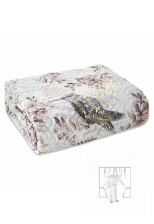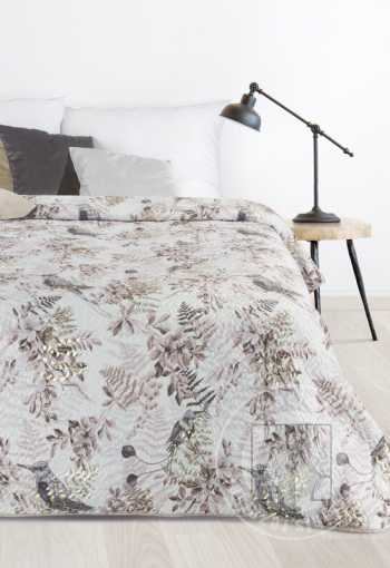 Prehoz POLY z mäkkej velúrovej tkaniny, zdobený letným vzorom vtáčikov a vetvičiek dodá interiéru vašej spálne svieži letný nádych. Druhá strana prehozu má hladký sivobéžový odtieň a je vyrobená z mikrovlákna, takže prehoz sa nepohybuje a vždy ostane na svojom mieste. Jemna púdrovo sivá potlač je zvýraznená zlatými odleskami v podobe listov papradia.