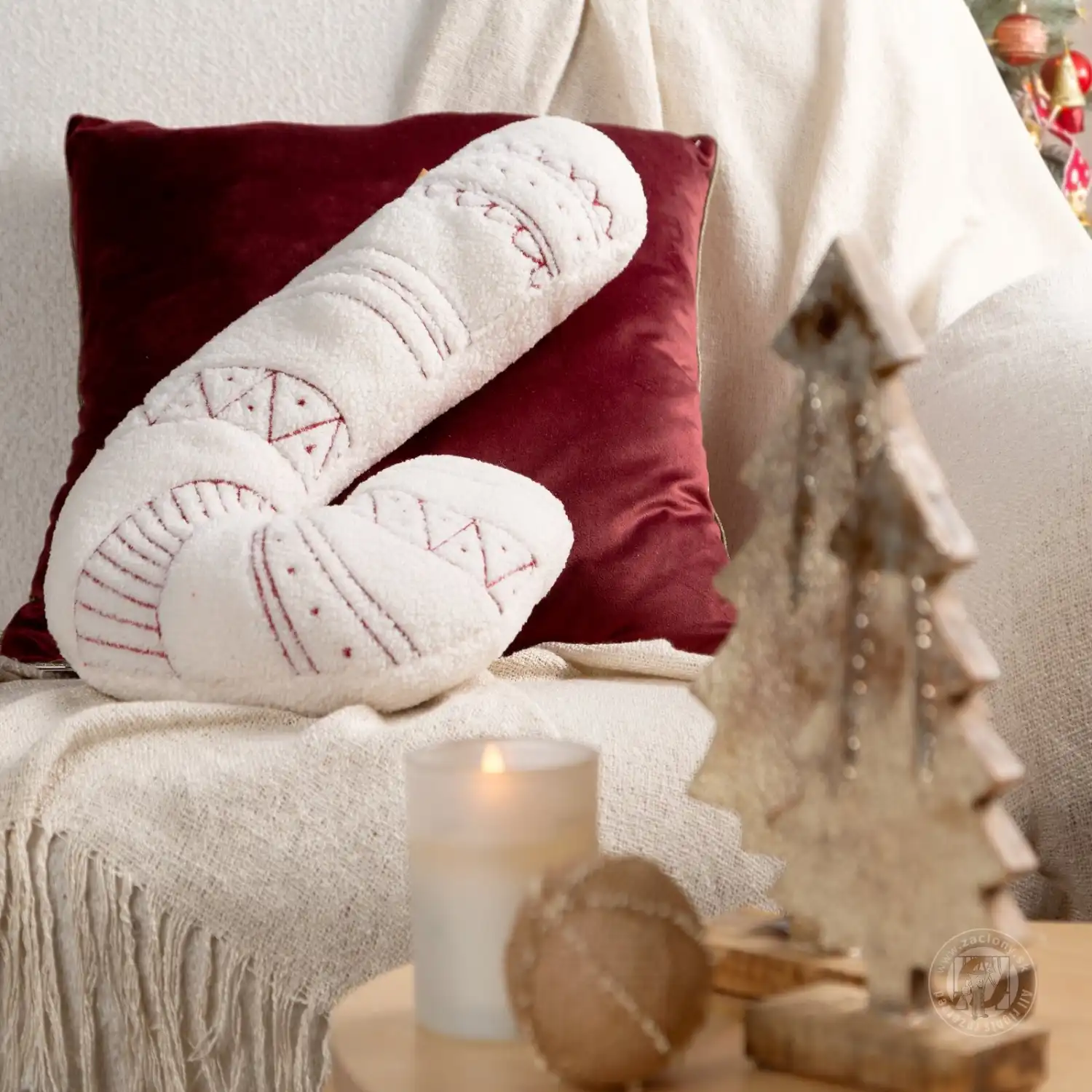 Tento jedinečný vianočný vankúš v tvare lízatka je jedinečnou dekoráciou, ktorá okamžite prinesie radostnú vianočnú atmosféru do každej miestnosti. Vyrobený z módnej látky bukla, poteší svojou mäkkou textúrou a jedinečným vzhľadom. Zdobený elegantnou výšivkou.