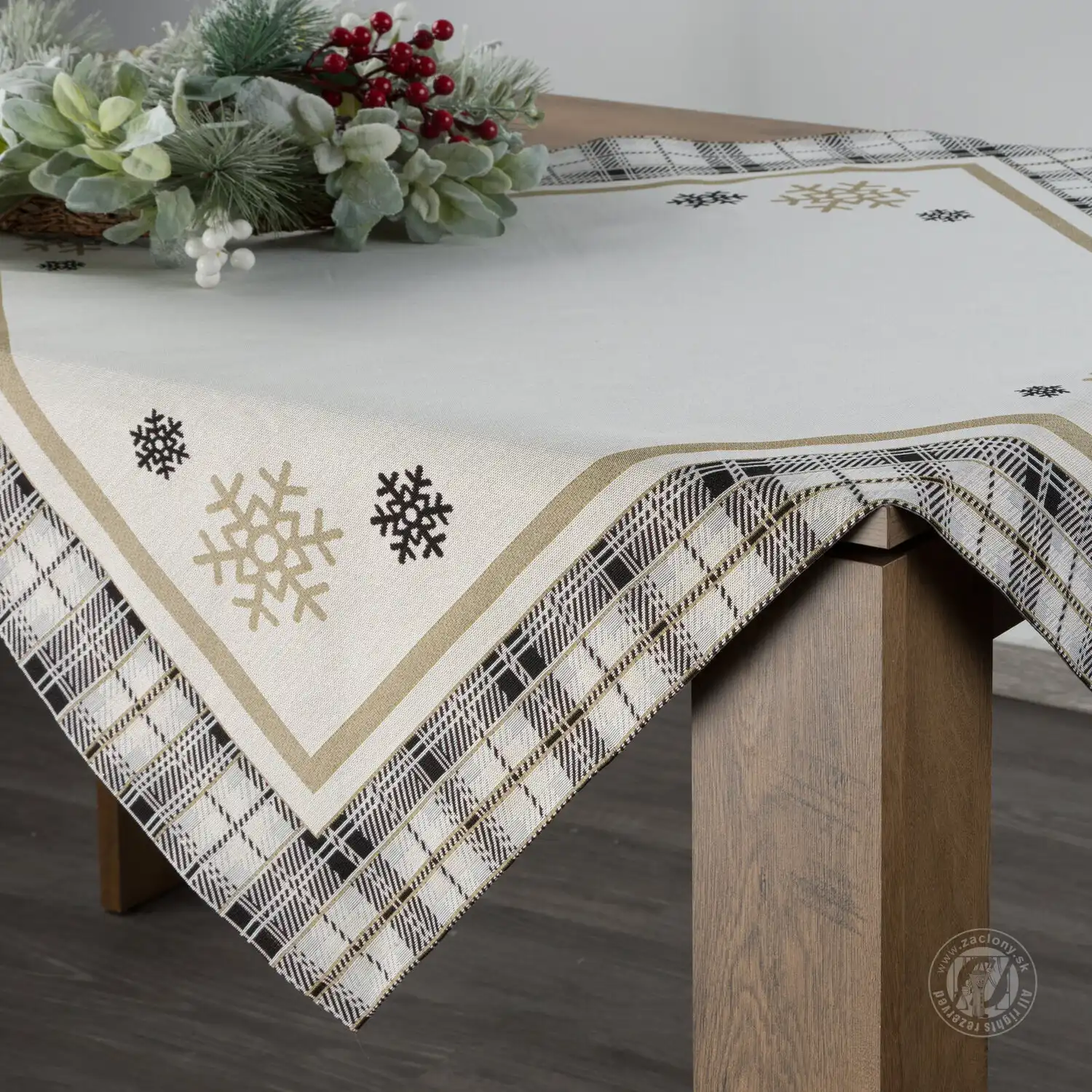 Tento vianočný gobelínový obrus, vyrobený z hrubej látky a zdobený kockovaným vzorom a zlatými snehovými vločkami, dodá vášmu interiéru nádych sviatočného šmrncu. Hrubšia žakárová látka so zlatými akcentmi dodáva dekorácii jemný lesk a technika tkania vytvára jedinečne krásny obrus.