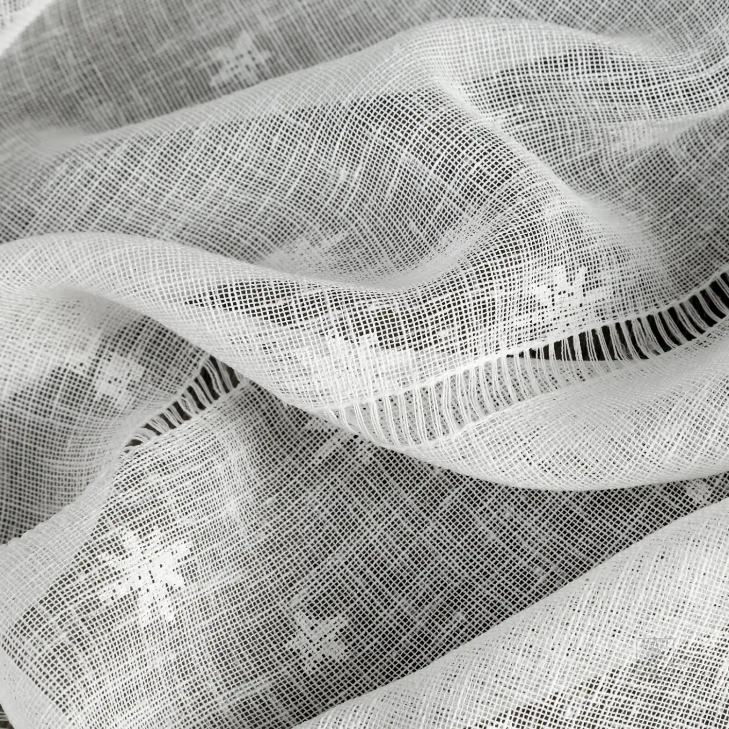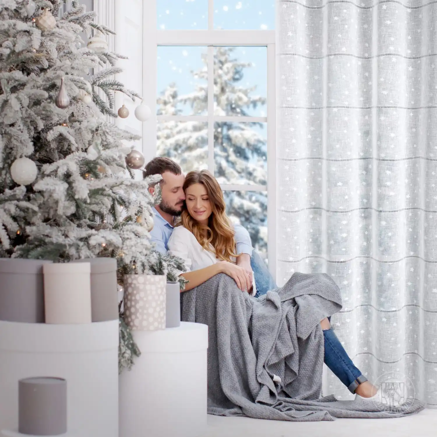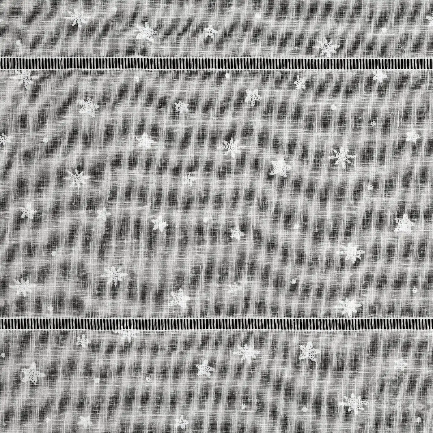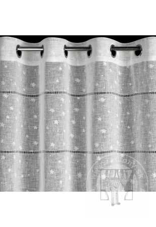 Táto elegantná záclona vyrobená z jemnej gázy dodá každému interiéru nádych ľahkosti a jemného šarmu. Priehľadná látka je ozdobená potlačou drobných, trblietavých hviezdičiek a prelamovaných pruhov, ktoré celému kusu dodávajú jedinečný charakter a krásne rozptyľujú denné svetlo.
