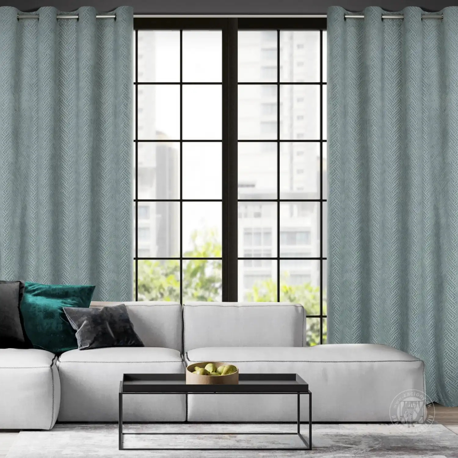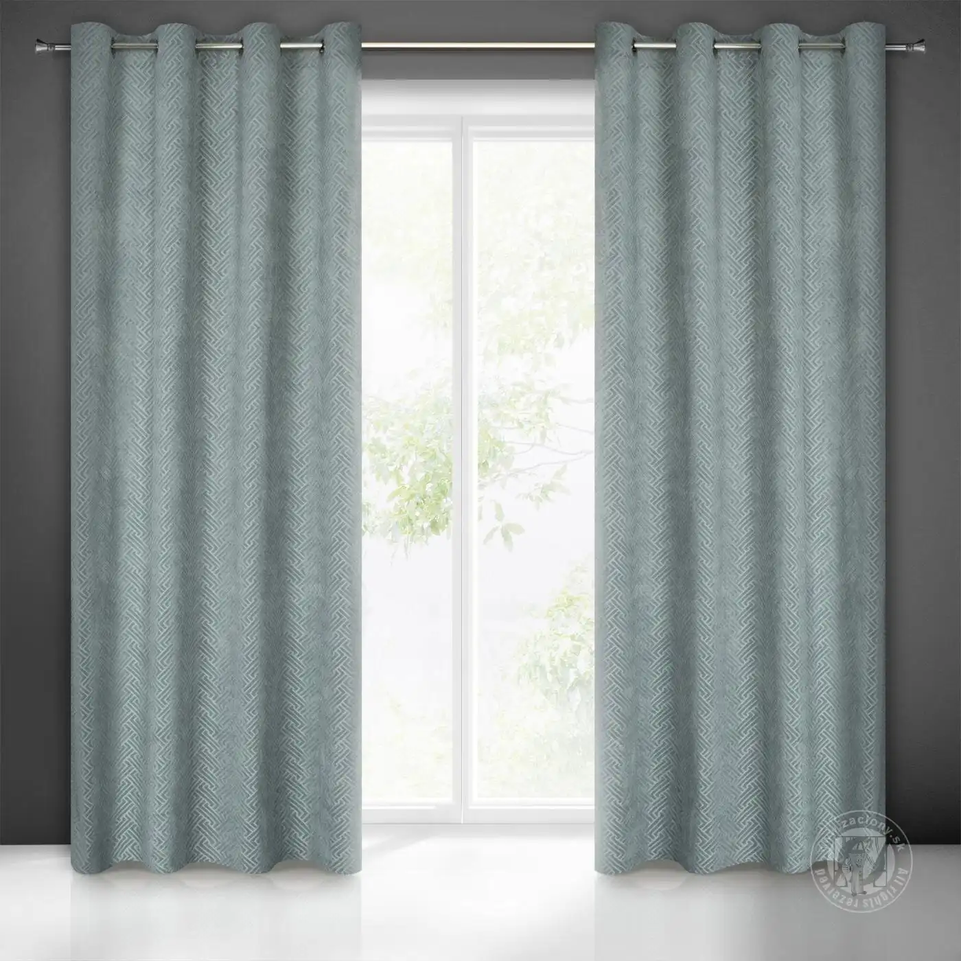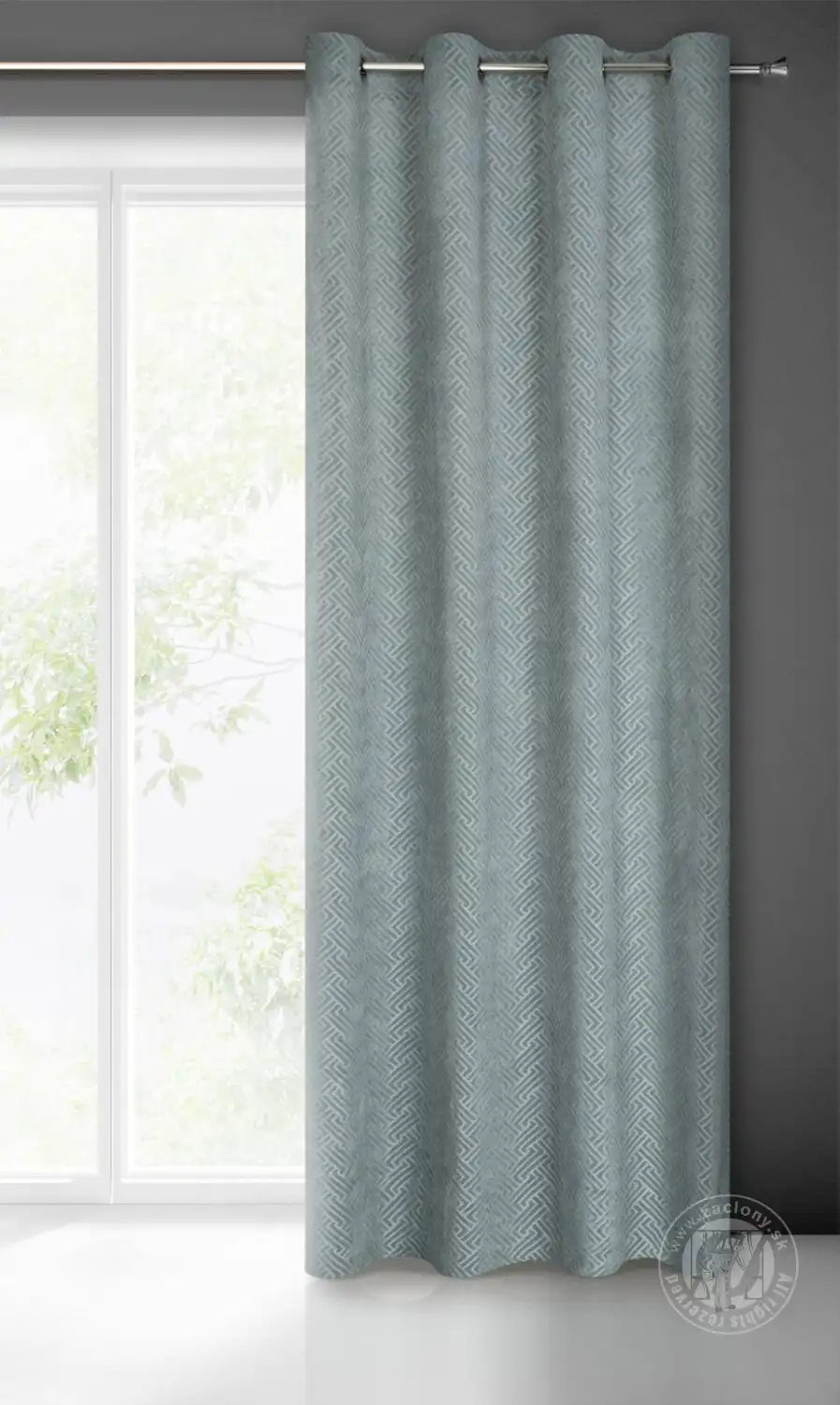 Záves ISLA vyrobený z matného zamatu láka svojou jemnosťou a prelamovaným geometrickým vzorom. Geometrický žakárový vzor na látke bol vytvorený technikou tkania. Jemná jemnosť, výrazný lesk a jednotná farebná schéma robia z tohto doplnku ideálny do interiérov zariadených v módnom, glamour štýle. Praktické očká uľahčujú zmenu dekorácie. Hrubší vzor je prekladaný tenšími, priehľadnými prvkami, čím vytvára zaujímavý prelamovaný efekt na okne.č.