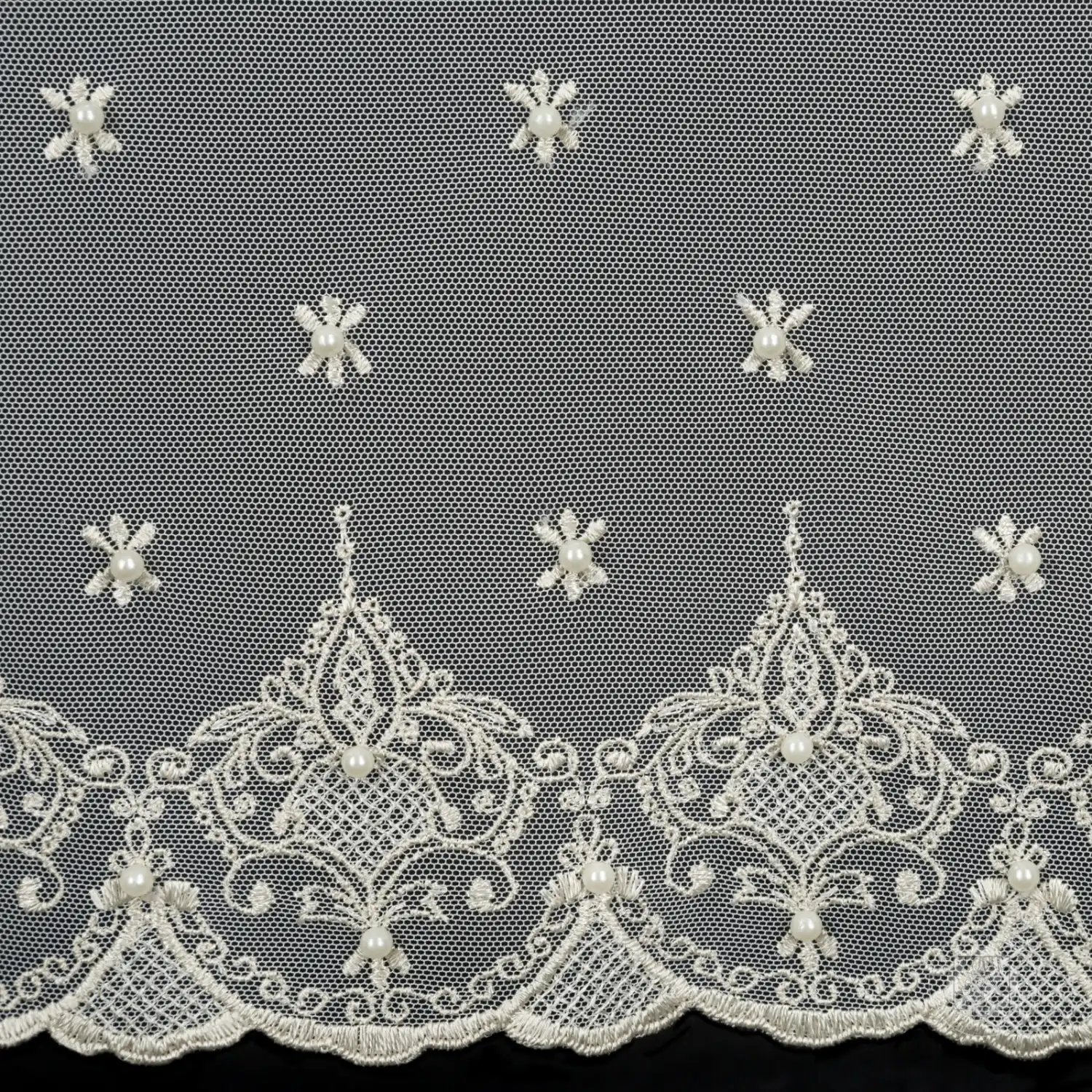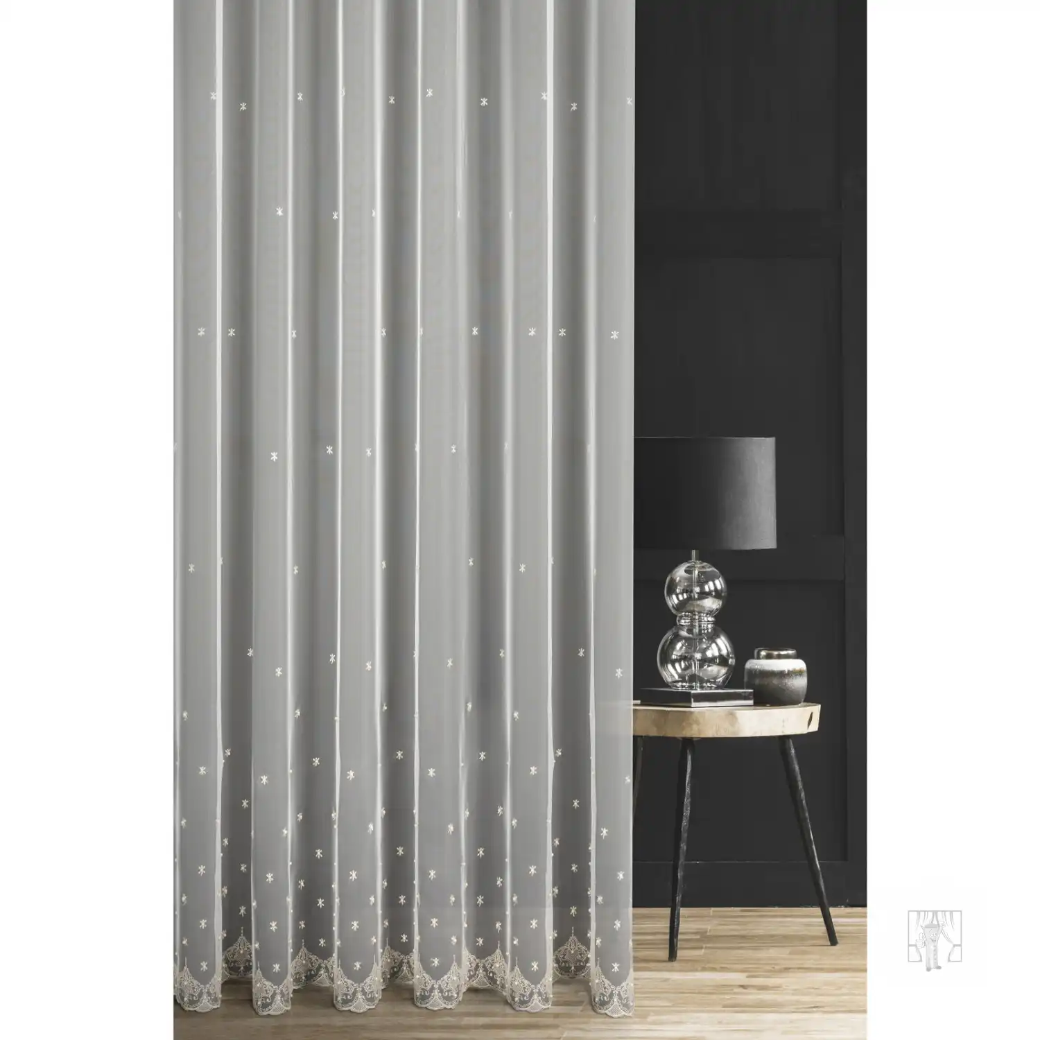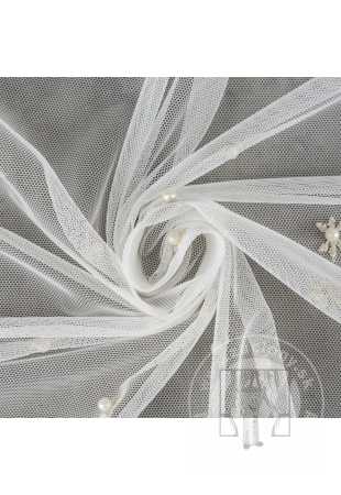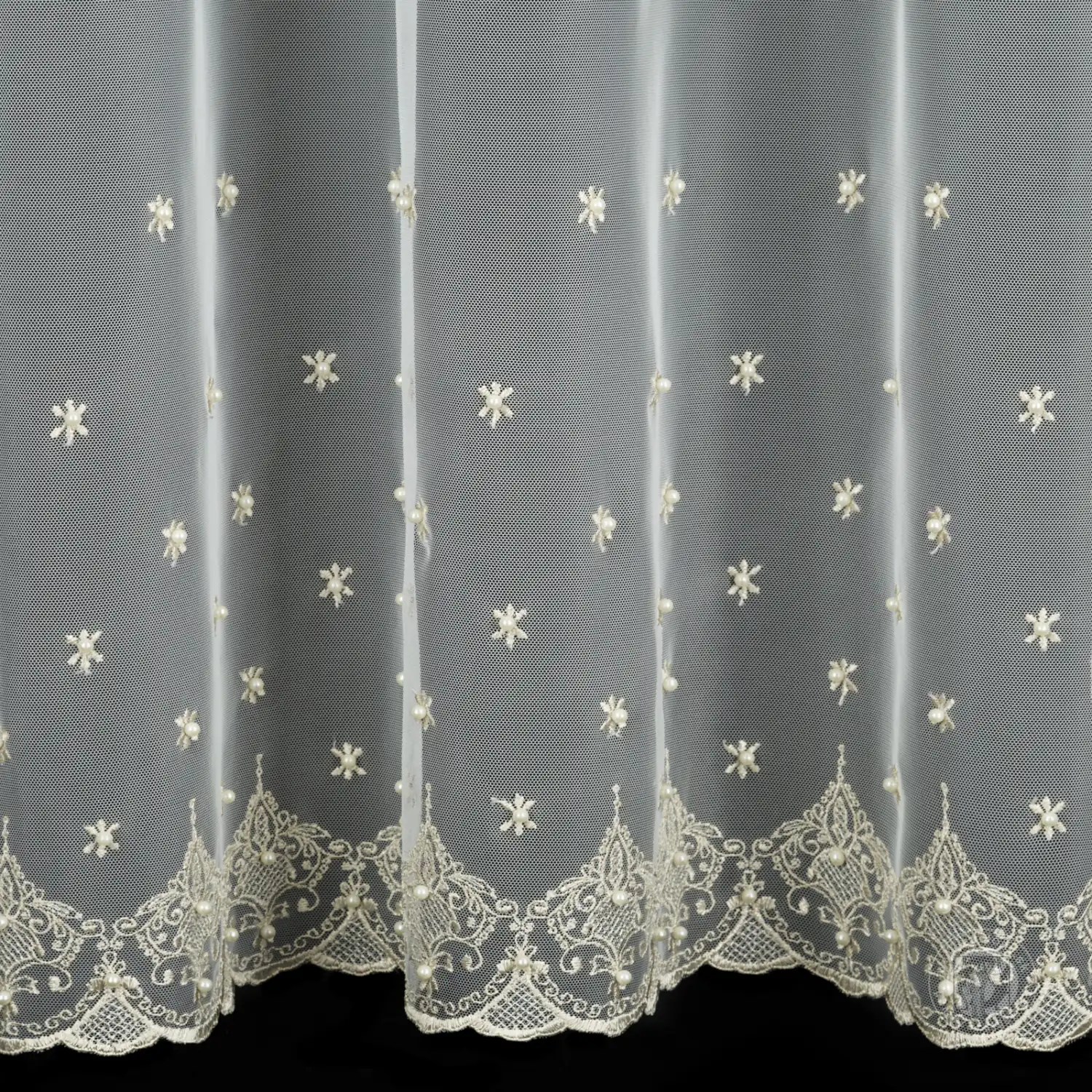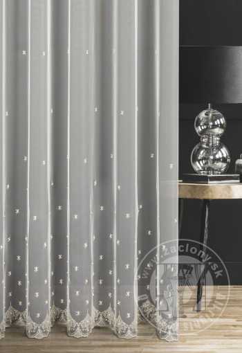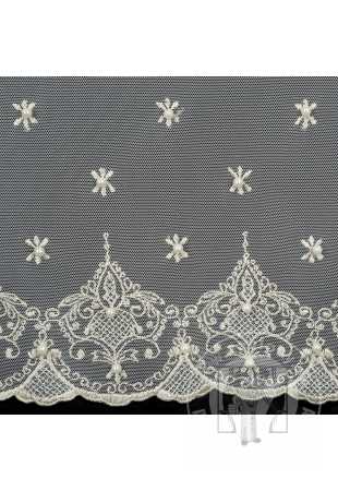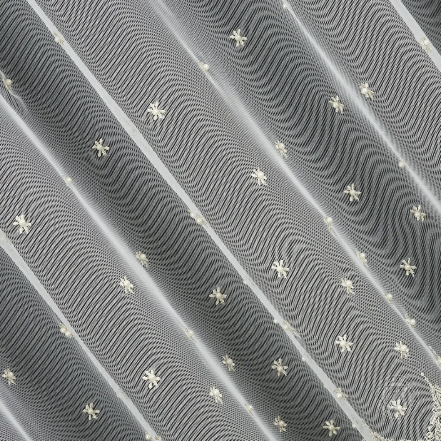 Záclonová látka z jemného tylu s vyšívanými ornamentmi zdobenými perlami. Luxusná metráž na záclony do obývačky aj spálne, elegantne prepúšťa svetlo, dodá interiéru romantický a prémiový vzhľad.