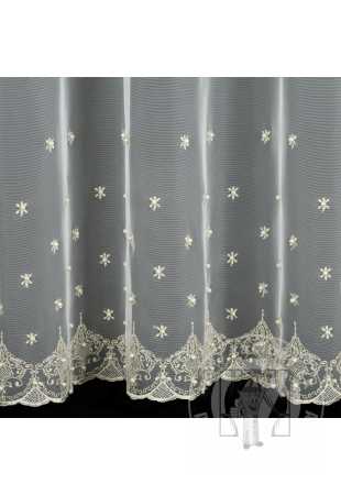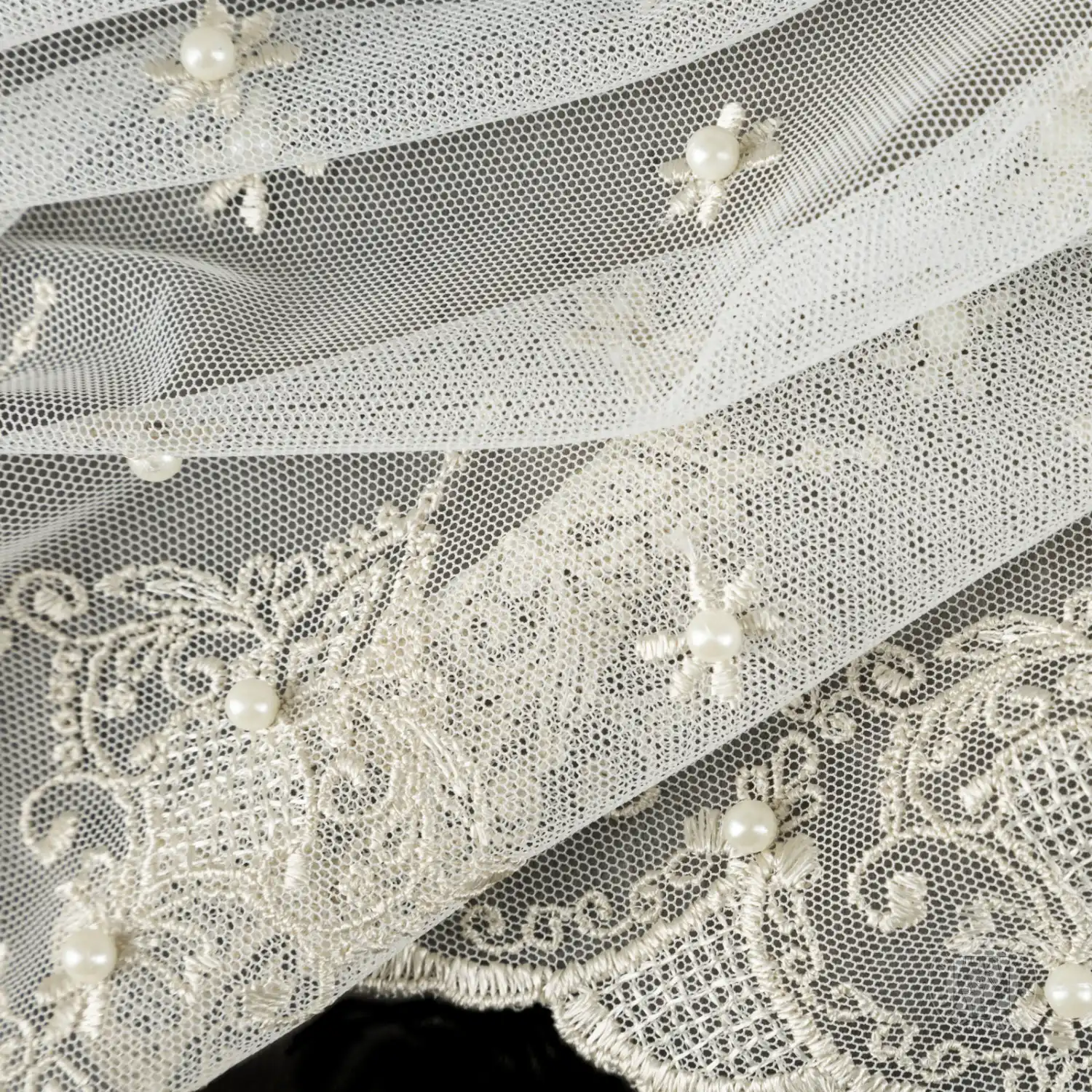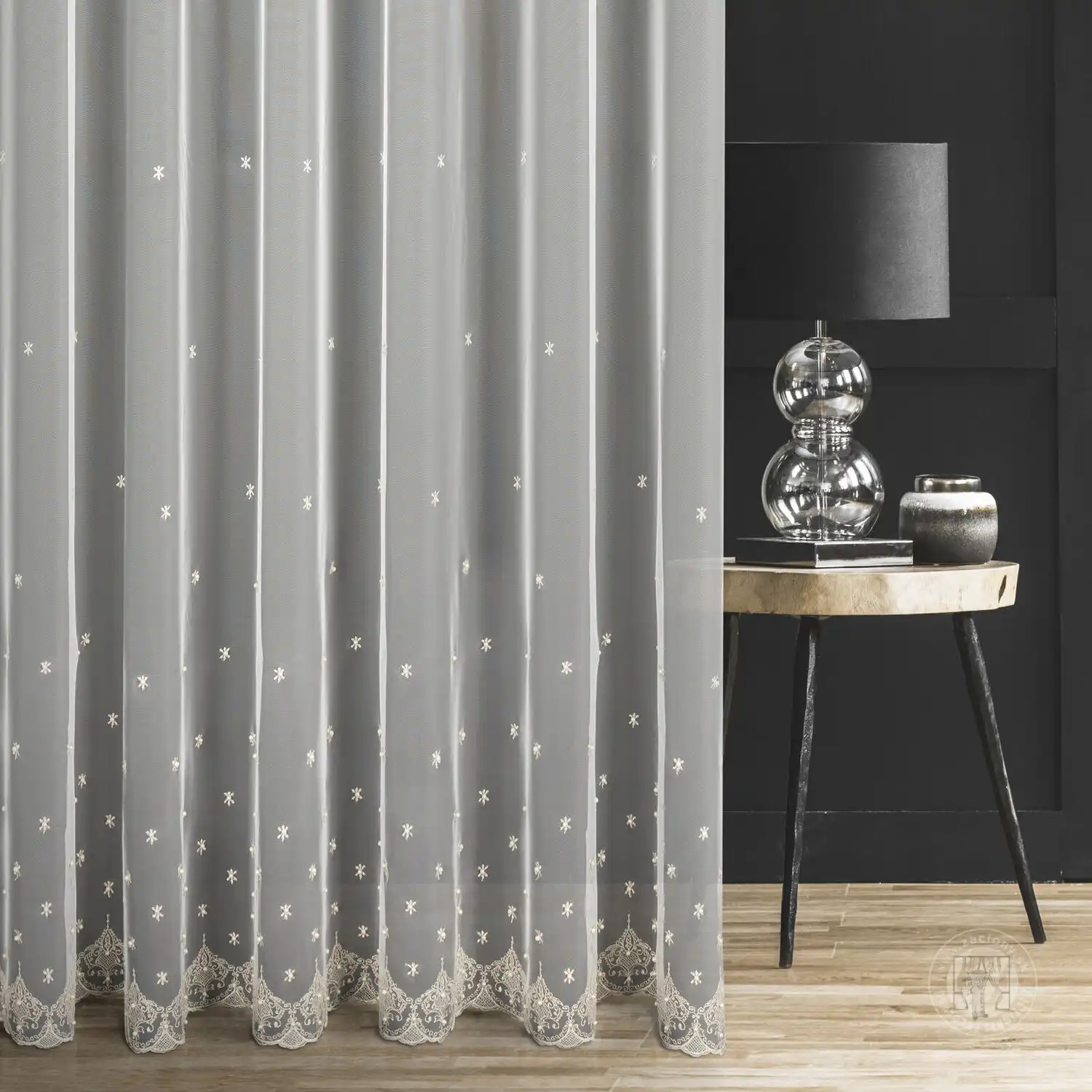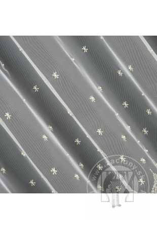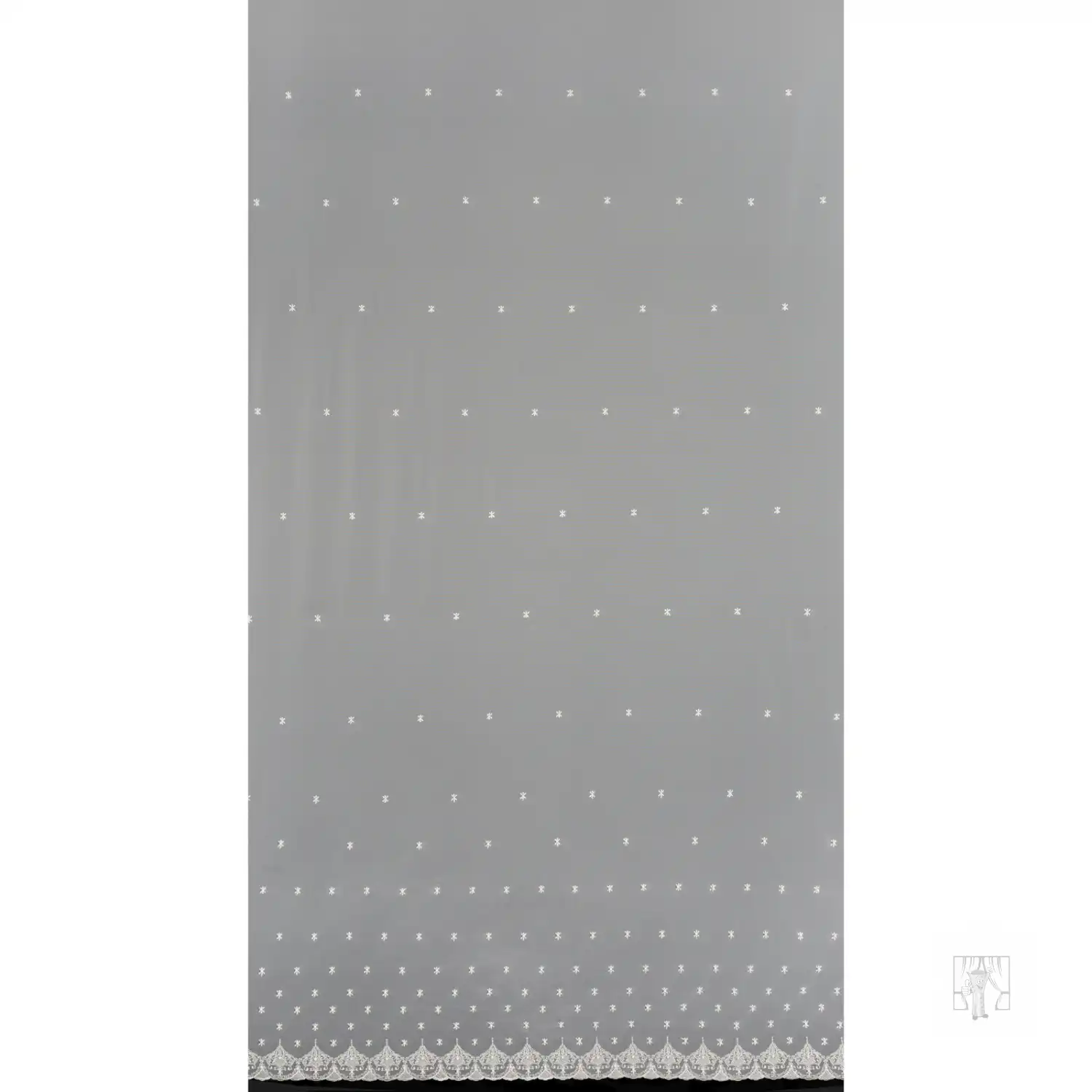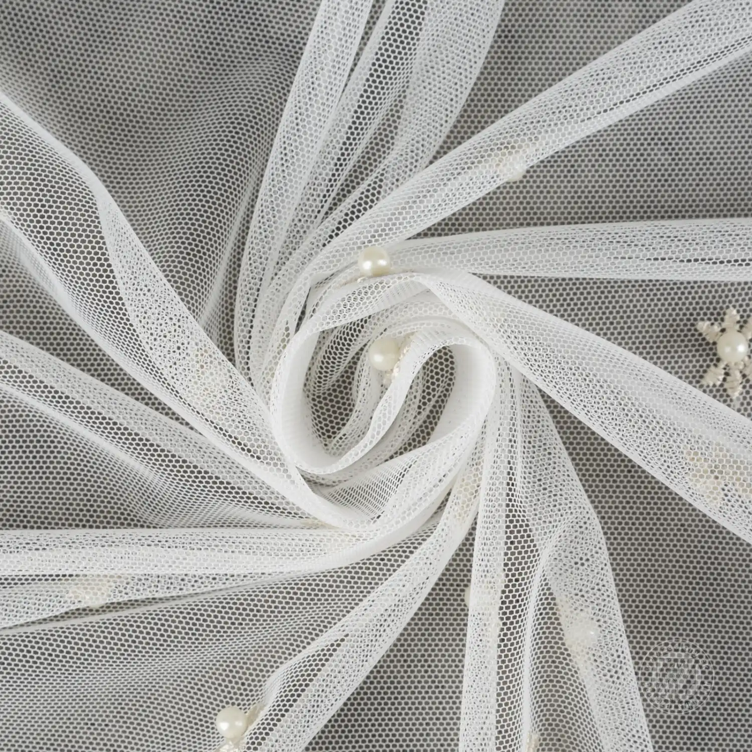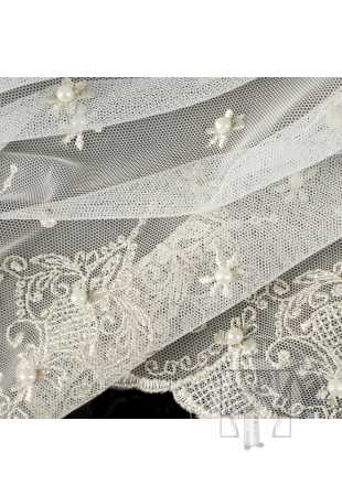 Záclonová látka z jemného tylu s vyšívanými ornamentmi zdobenými perlami. Luxusná metráž na záclony do obývačky aj spálne, elegantne prepúšťa svetlo, dodá interiéru romantický a prémiový vzhľad.