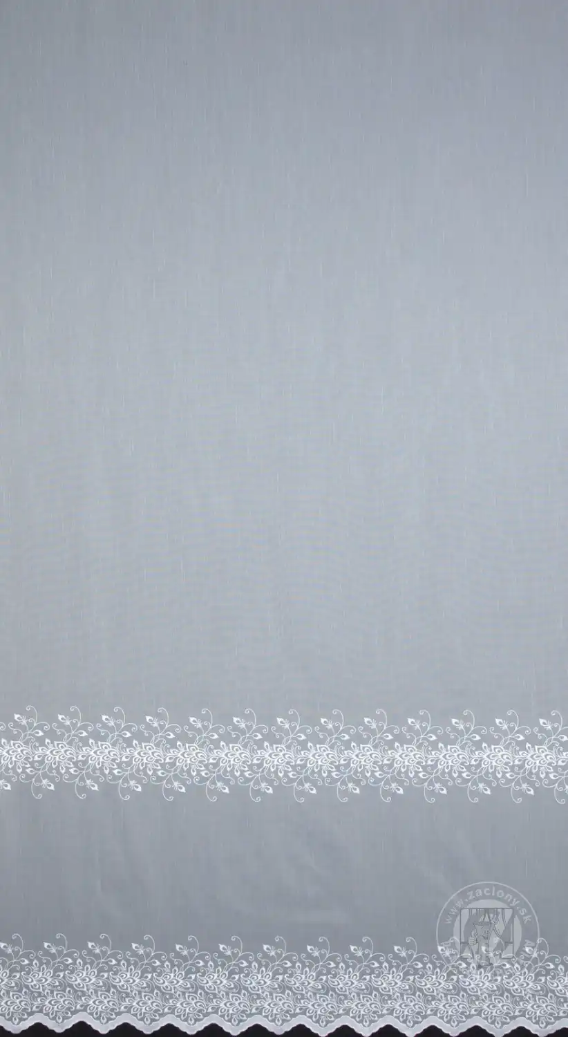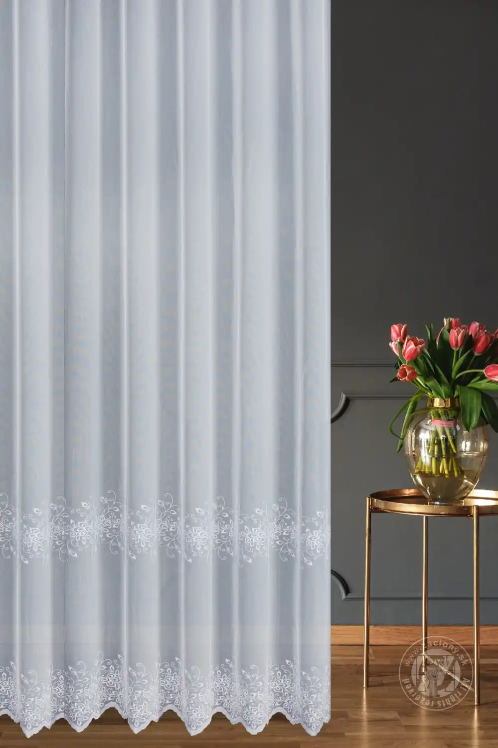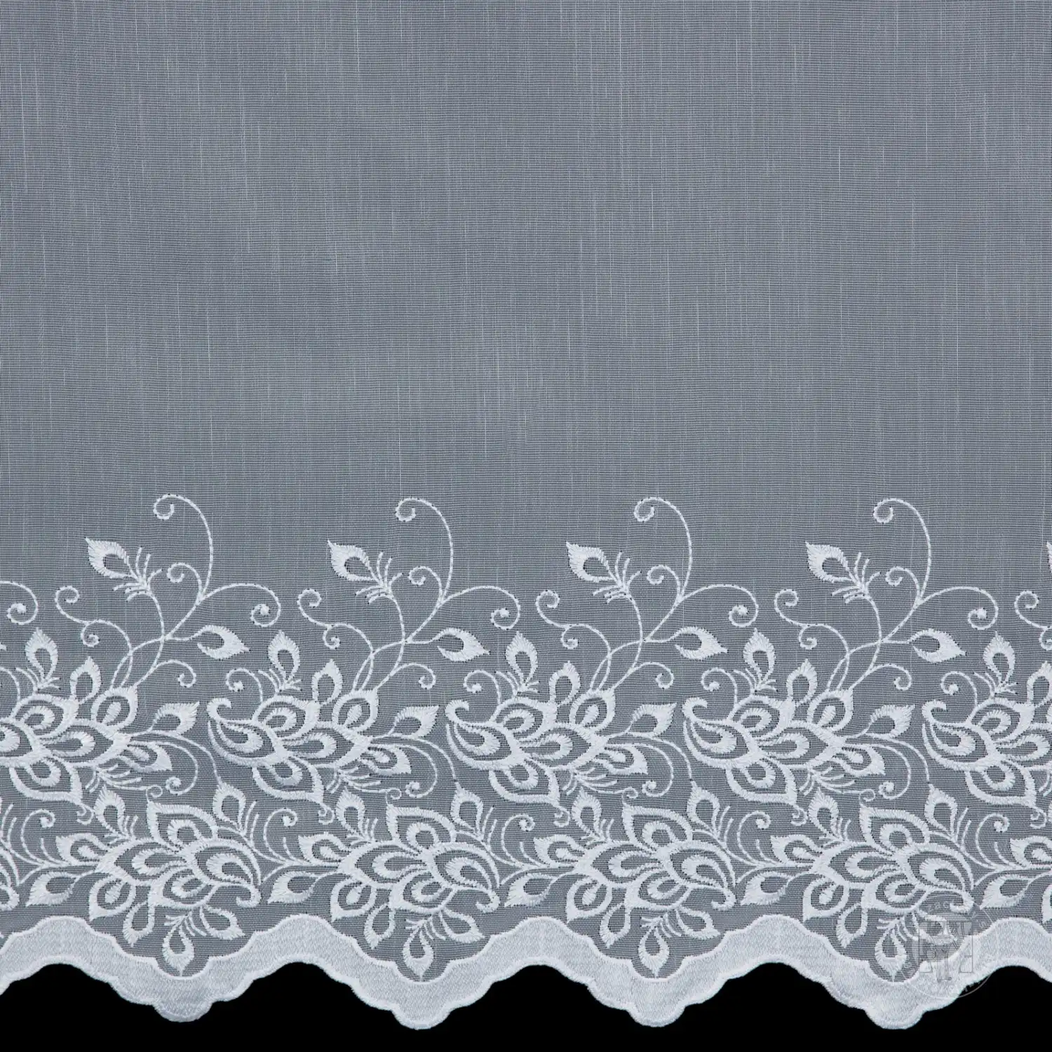 Jemne tkaná záclona ozdobená dvoma prúžkami kvetinovej výšivky s vetvičkami. Vyšívaný vzor vyzerá veľmi jemne a jemný vlnitý lem záclony, zakončený výšivkou, poteší každého. Polopriehľadná látka jemne zakrýva okno bez toho, aby tlmila svetlo v interiéri.