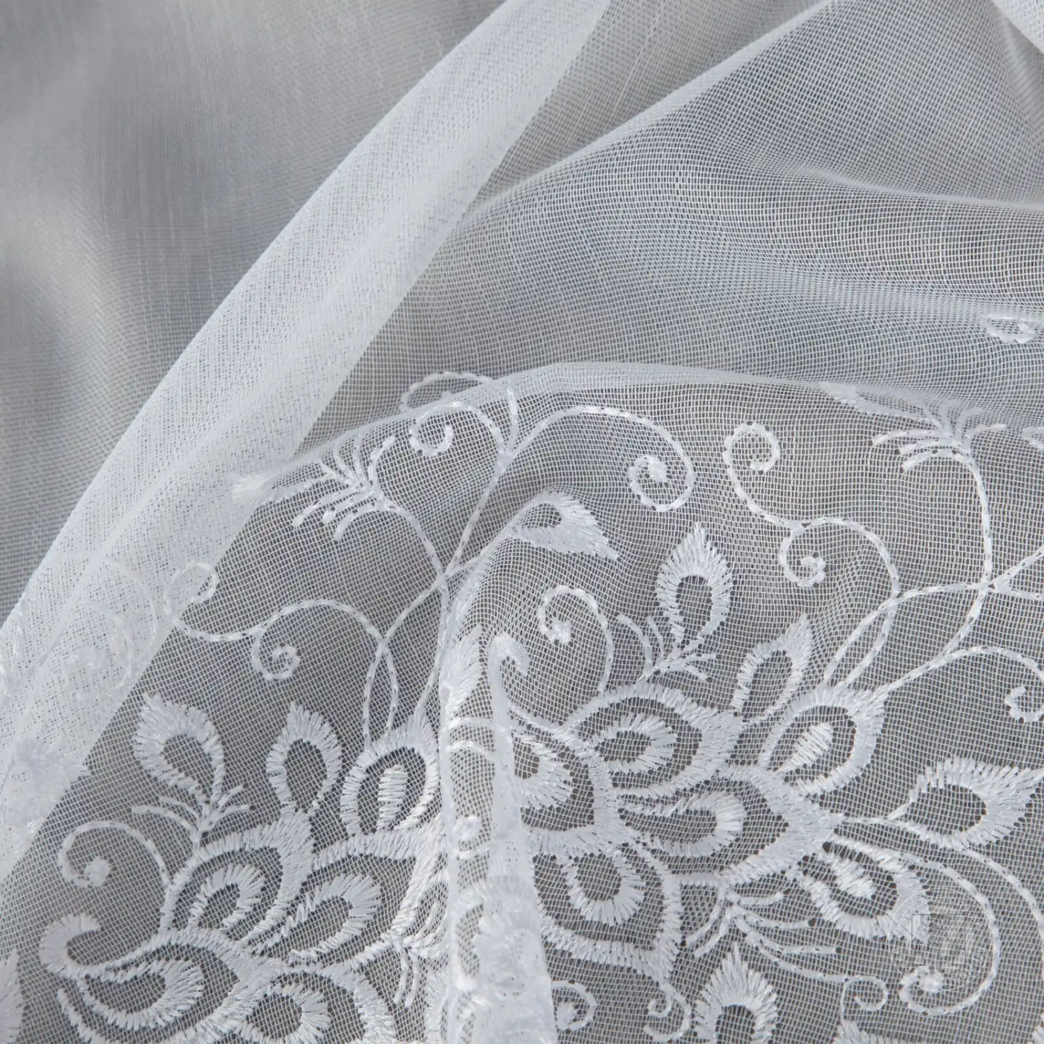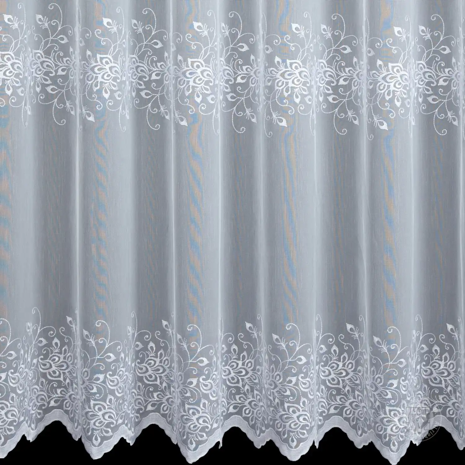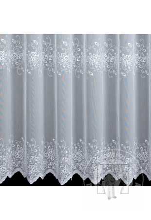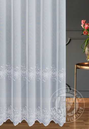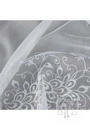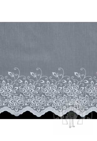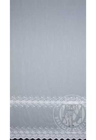 Jemne tkaná záclona ozdobená dvoma prúžkami kvetinovej výšivky s vetvičkami. Vyšívaný vzor vyzerá veľmi jemne a jemný vlnitý lem záclony, zakončený výšivkou, poteší každého. Polopriehľadná látka jemne zakrýva okno bez toho, aby tlmila svetlo v interiéri.
