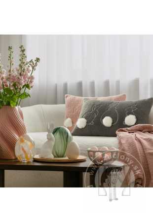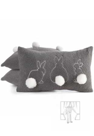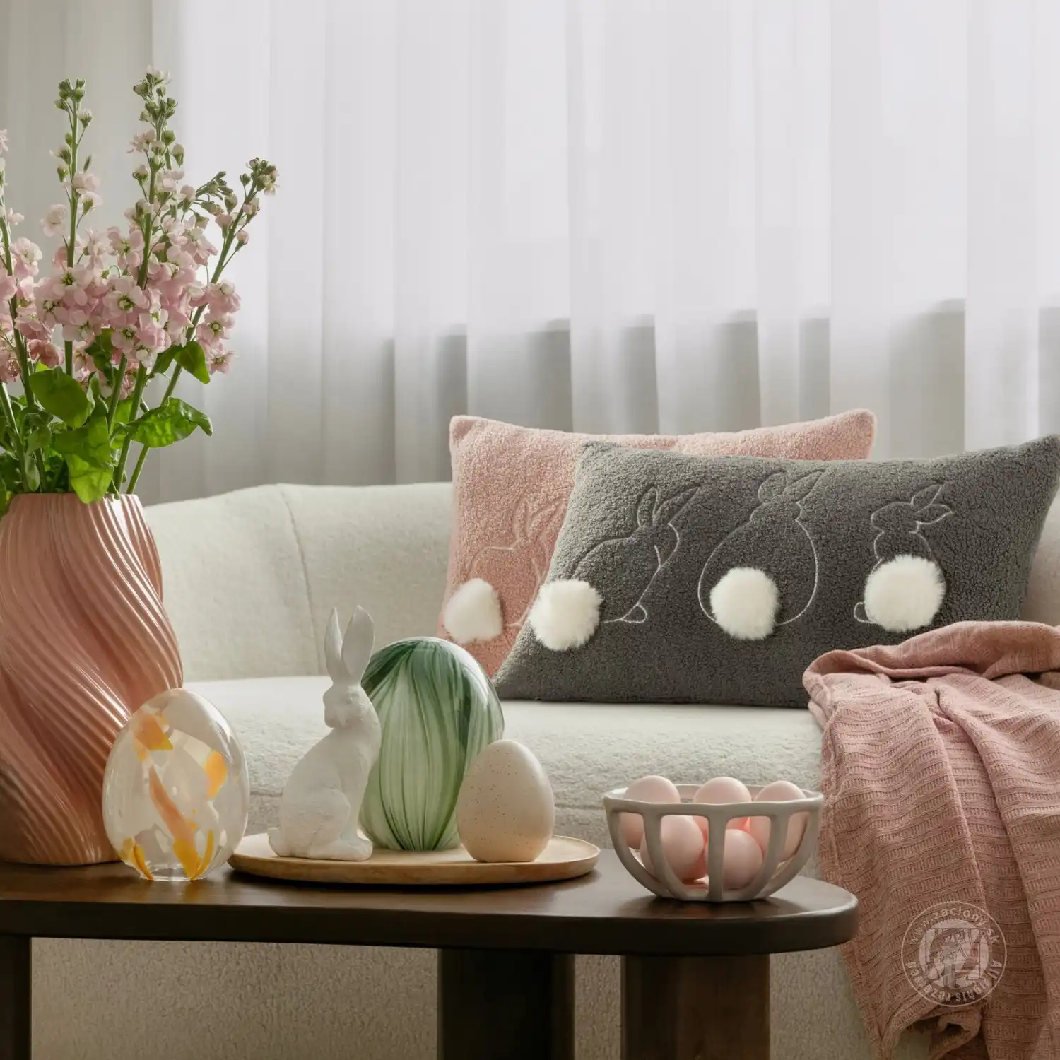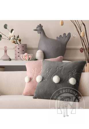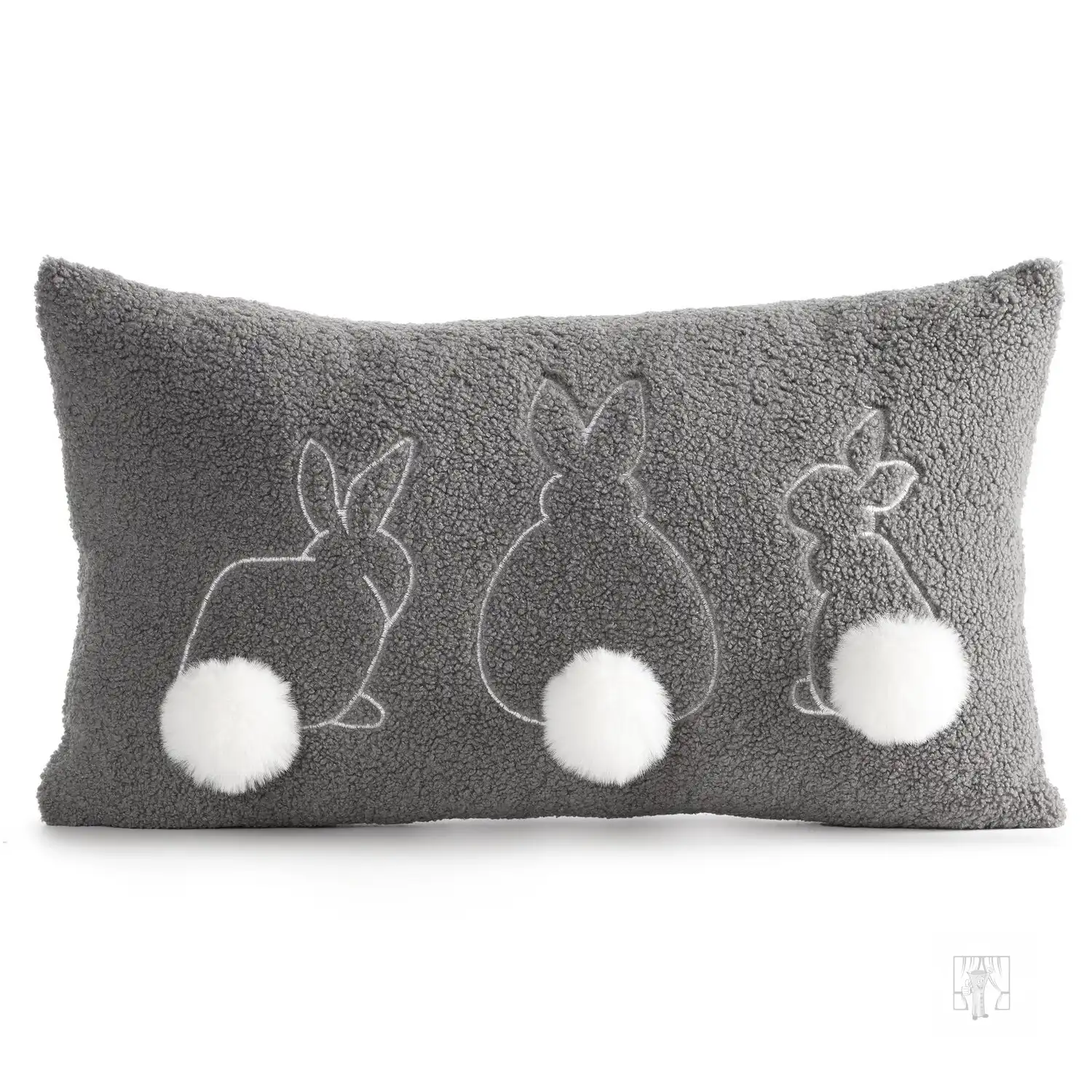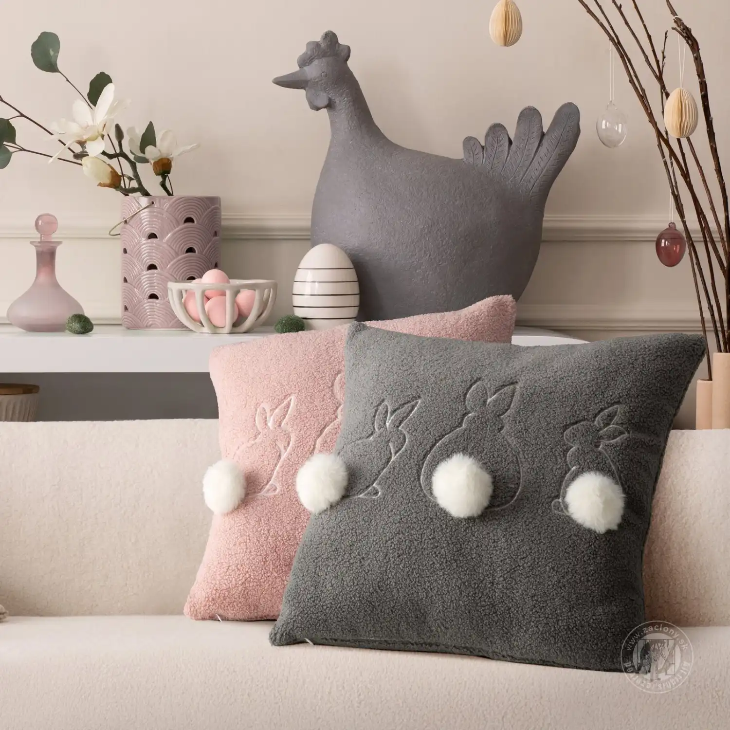 Dodajte svojmu domovu sviatočnú mágiu s touto veľkonočnou dekoratívnou obliečkou na vankúš vyrobenou z módnej buklé látky. Vyšívaný vzor rozkošných zajačikov s brmbolcami napodobňujúcimi zajačie chvostíky dodávajú radostný veľkonočný nádych.