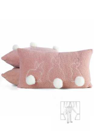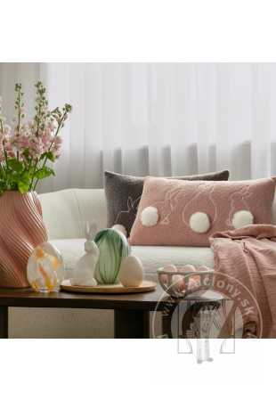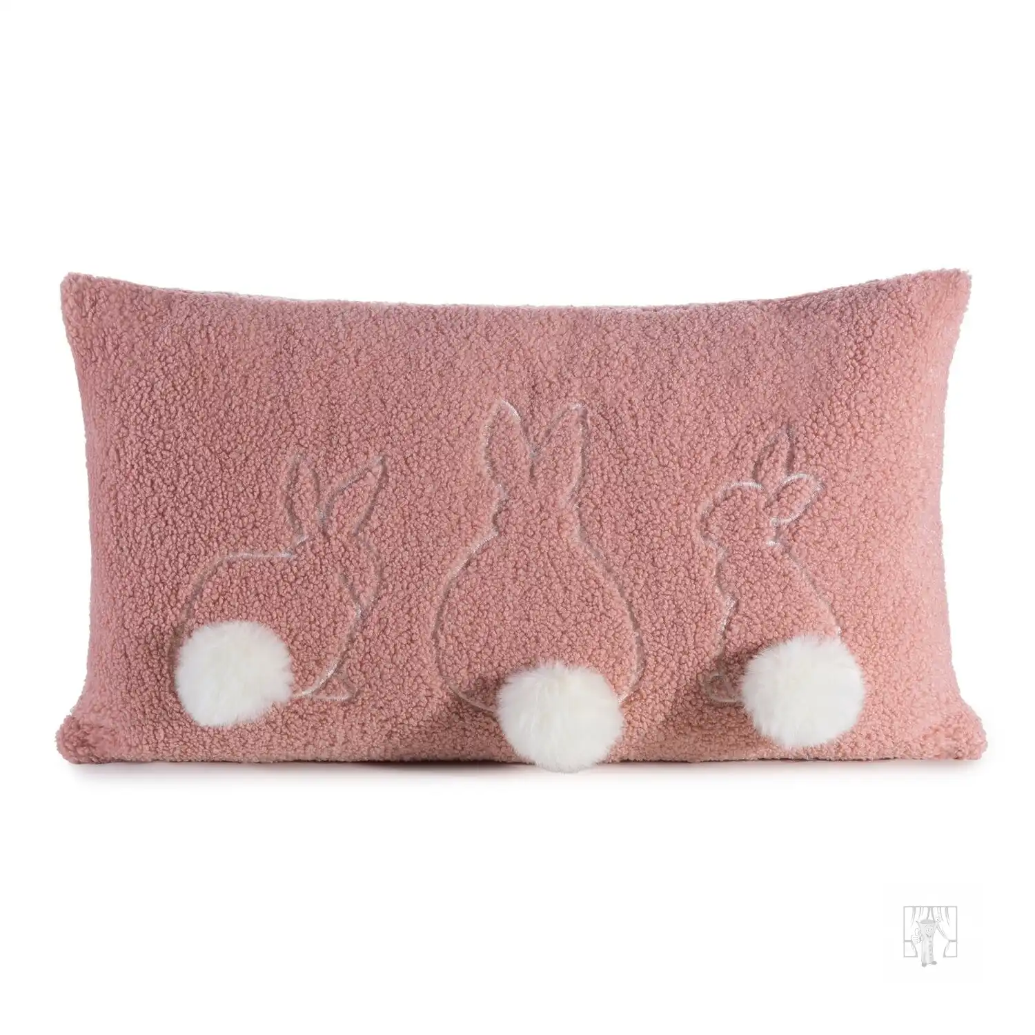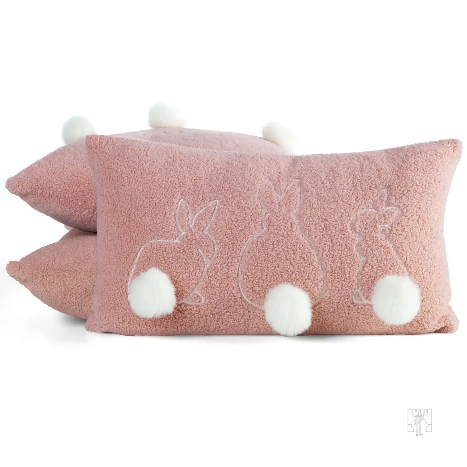 Dodajte svojmu domovu sviatočnú mágiu s touto veľkonočnou dekoratívnou obliečkou na vankúš vyrobenou z módnej buklé látky. Vyšívaný vzor rozkošných zajačikov s brmbolcami napodobňujúcimi zajačie chvostíky dodávajú radostný veľkonočný nádych.