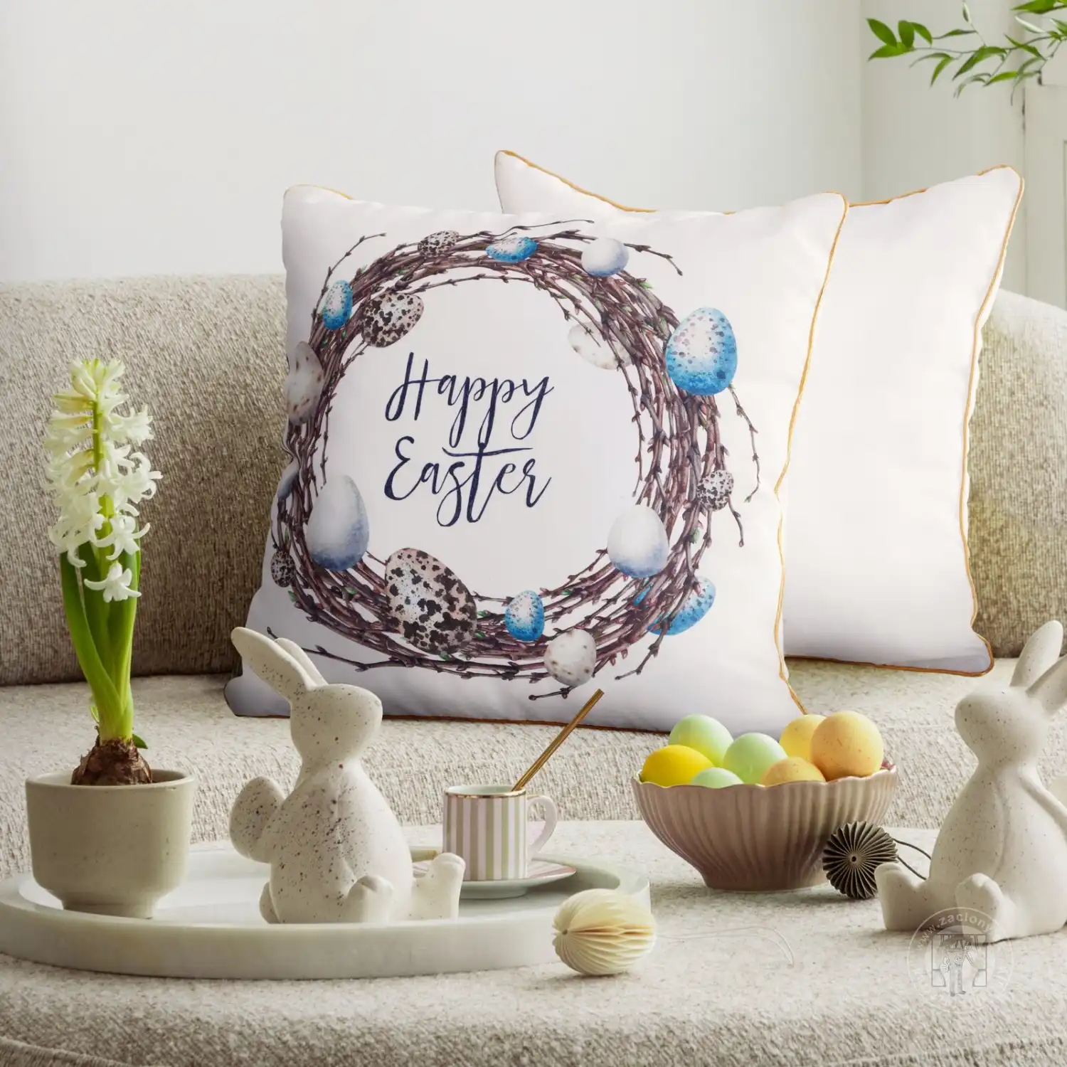 Obliečka na vankúš má skrytý zips, ktorý zaisťuje esteticky príjemný vzhľad a pohodlné používanie. Je to perfektný doplnok do vašej obývačky, spálne alebo jedálne na sviatky a dodá jemný nádych veľkonočnej radosti.