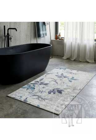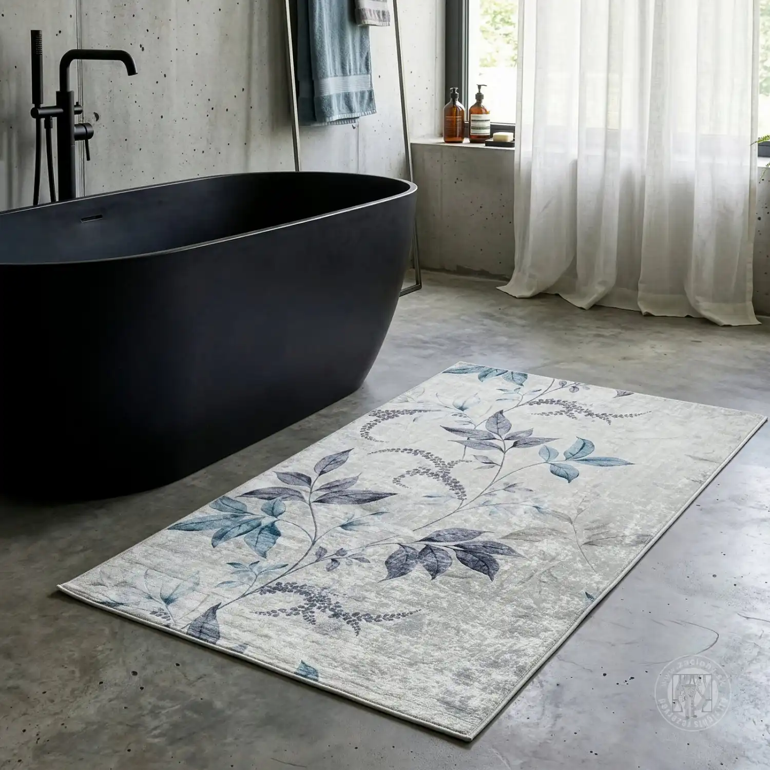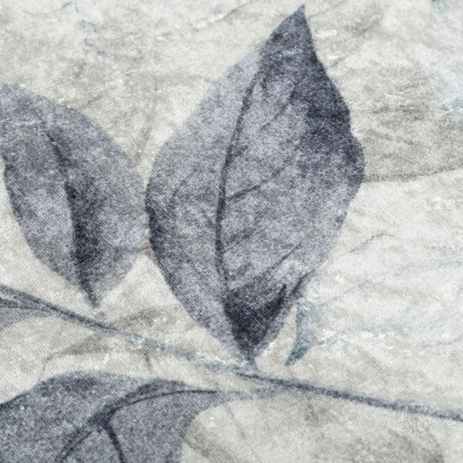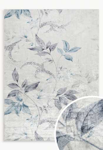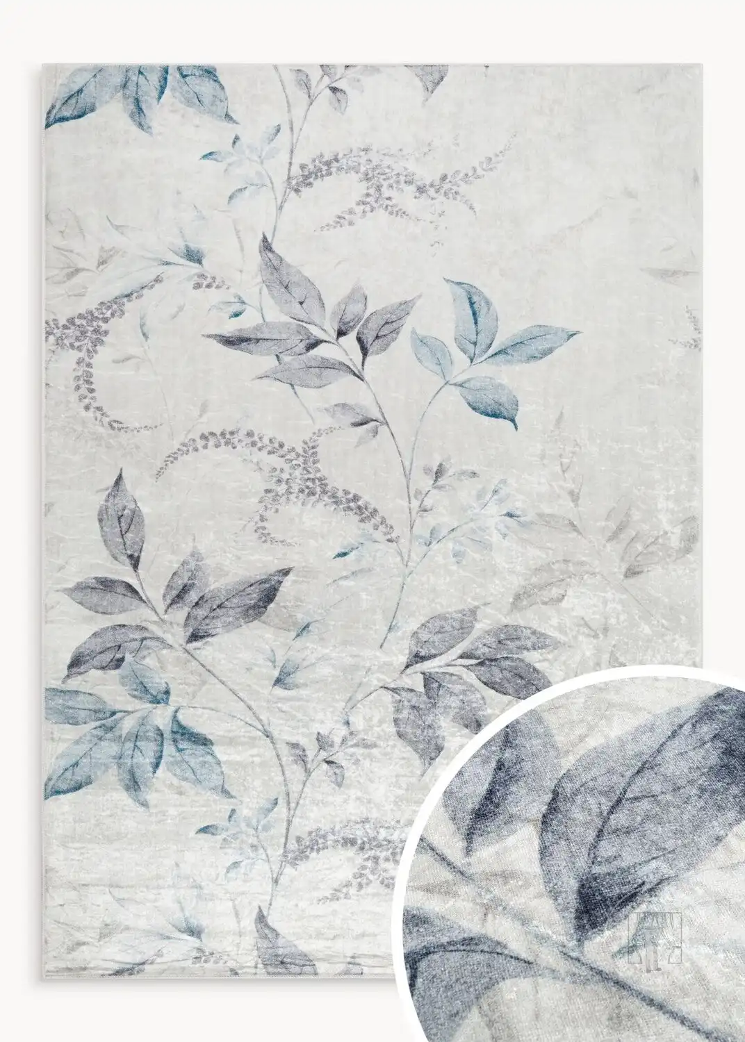 Dekoratívny koberec s jemným kvetinovým motívom, ktorý vnáša do interiéru ľahkosť a eleganciu. Vzor je založený na veľkých, jemne rozmazaných listoch, ktoré celému kusu dodávajú dekoratívny a pokojný nádych. Kompozícia je harmonická a nenápadná, vďaka čomu je vhodným pozadím pre dizajn a zároveň slúži ako dekoratívny prvok.