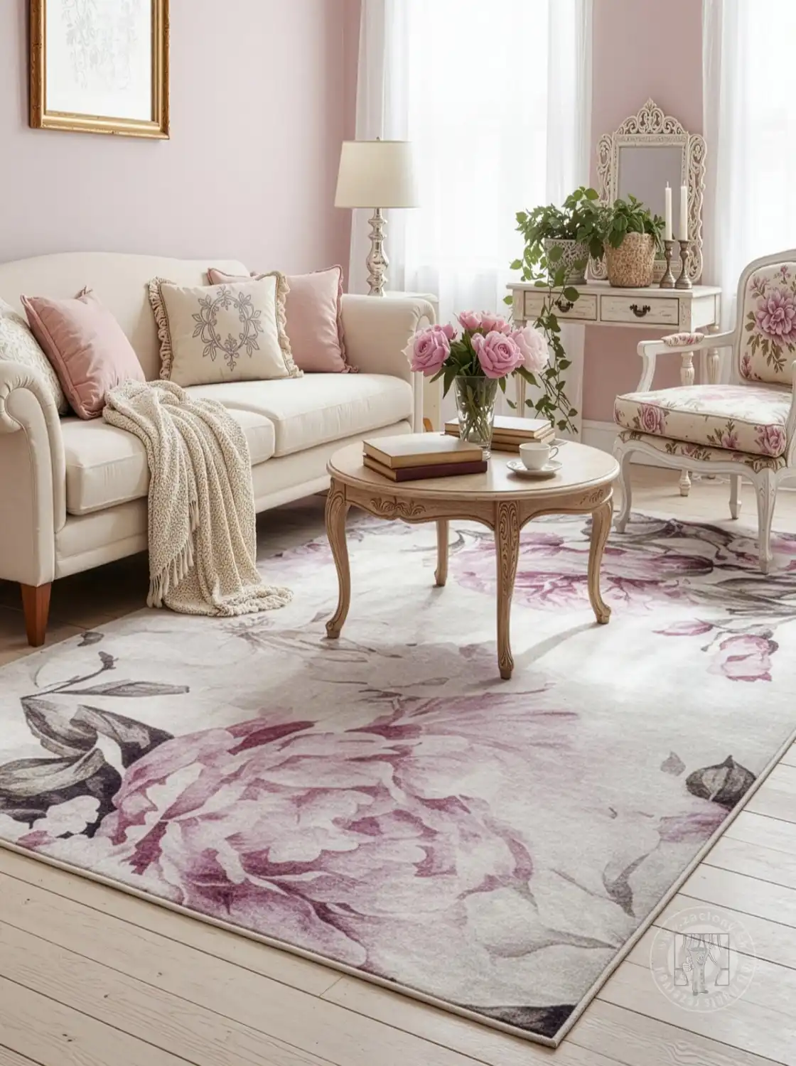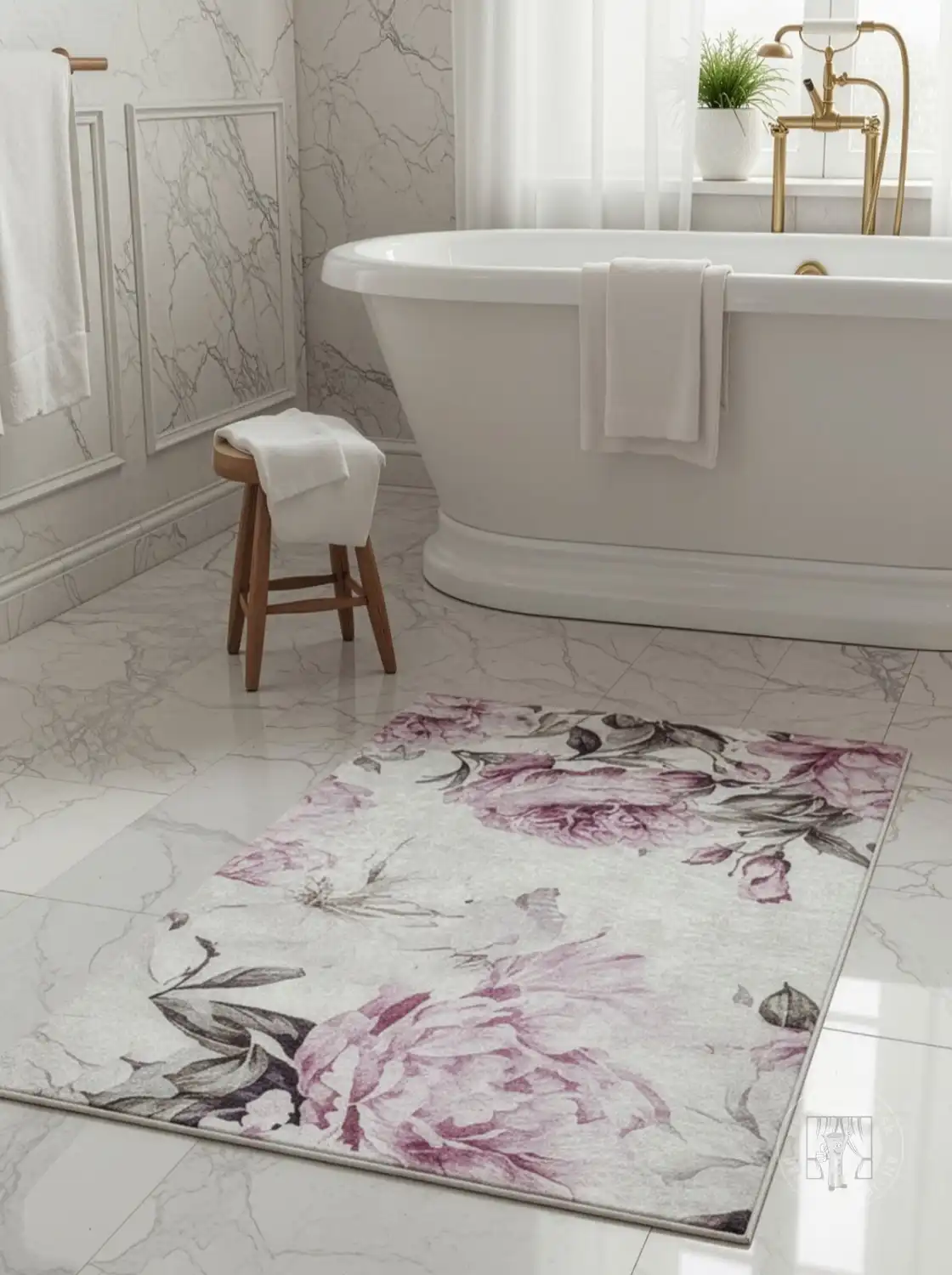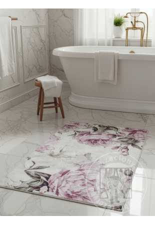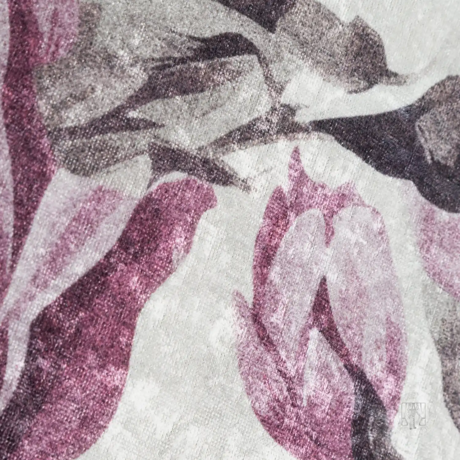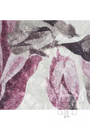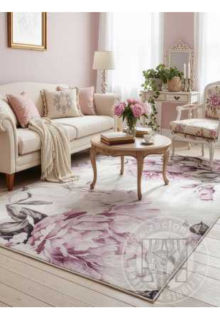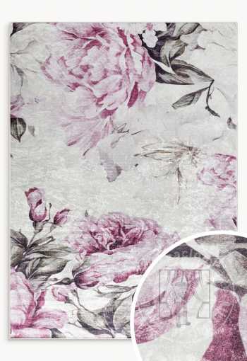 Dekoratívny koberec s jemným kvetinovým motívom, ktorý vnáša do interiéru ľahkosť a eleganciu. Vzor je založený na veľkých, jemne rozmazaných listoch, ktoré celému kusu dodávajú dekoratívny a pokojný nádych. Kompozícia je harmonická a nenápadná, vďaka čomu je vhodným pozadím pre dizajn a zároveň slúži ako dekoratívny prvok.