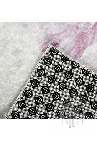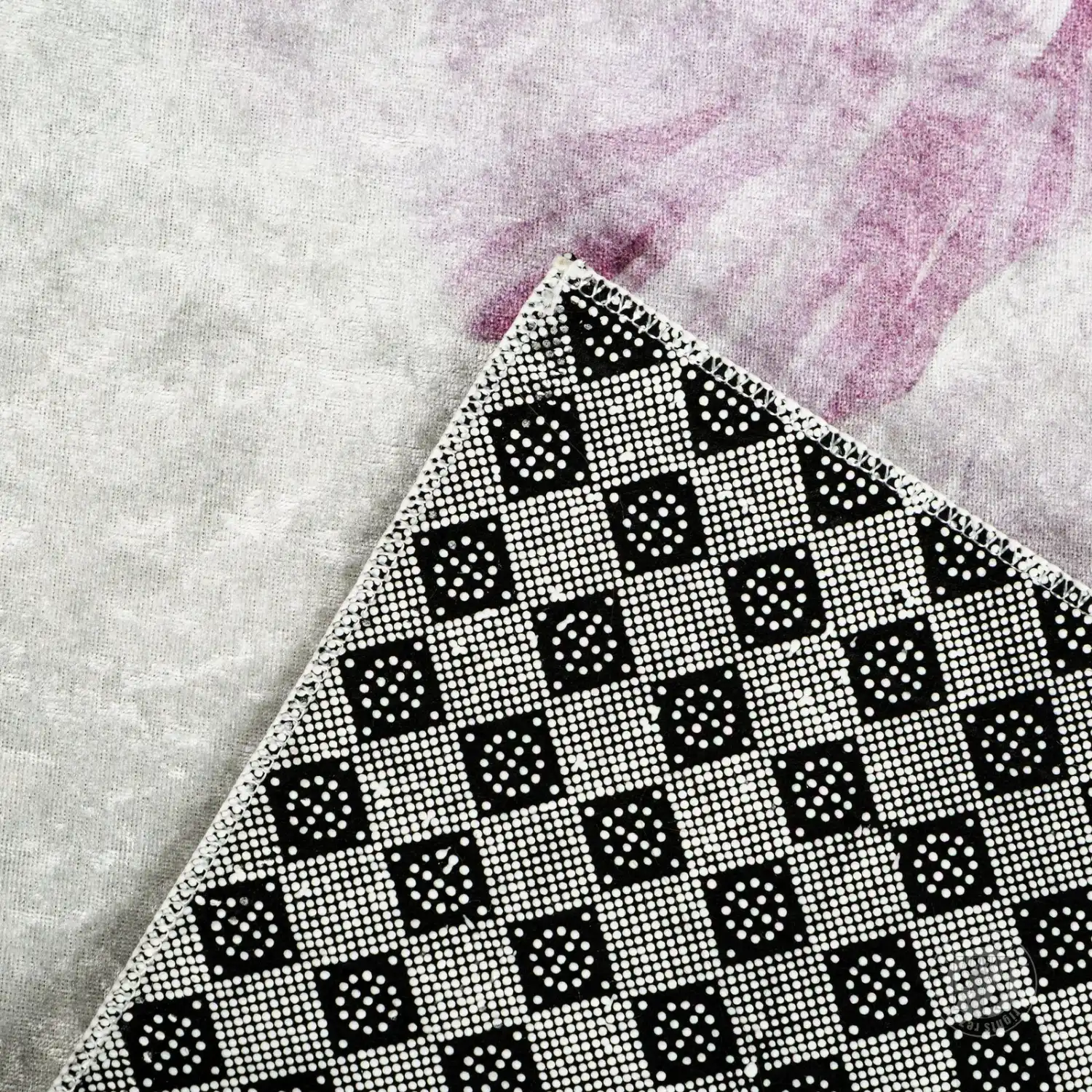 Zadná strana koberca je pokrytá protišmykovou vrstvou s geometrickou potlačou, ktorá zlepšuje stabilitu koberca na podlahe a zabraňuje jeho kĺzaniu.