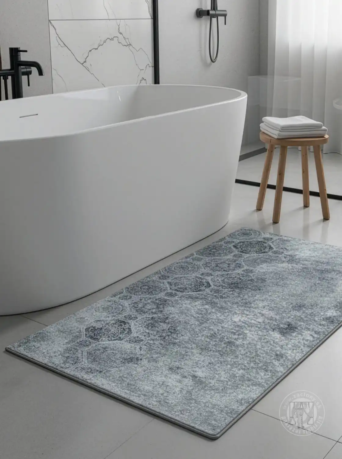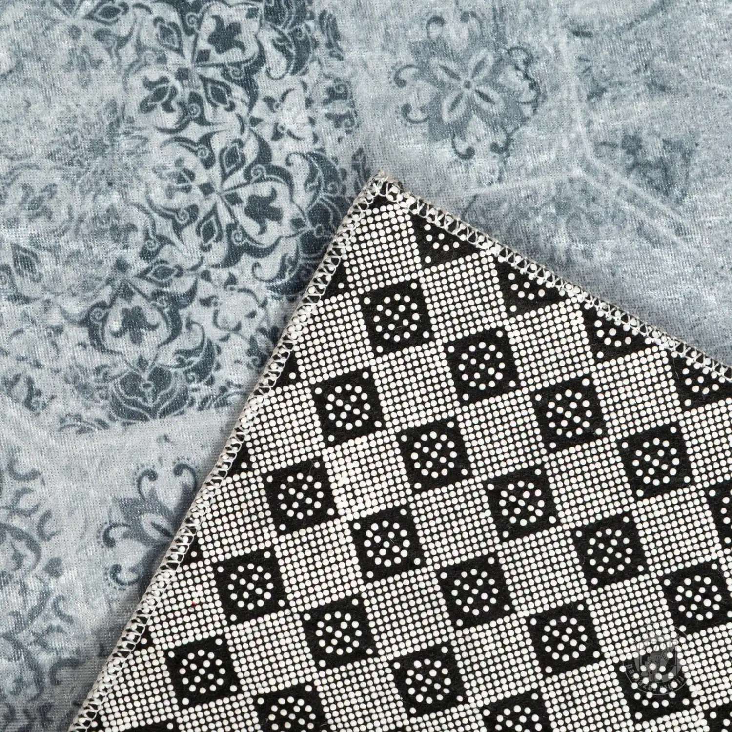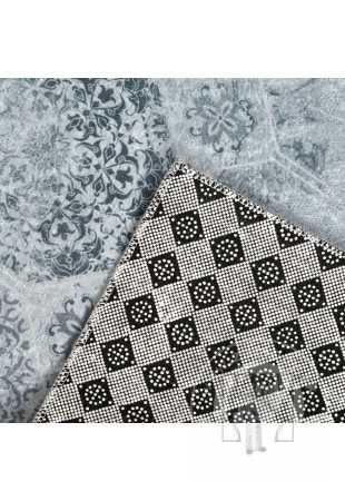 Zadná strana koberca má protišmykovú vrstvu s geometrickou potlačou, ktorá zabraňuje kĺzaniu koberca po podlahe a zvyšuje pohodlie pri každodennom používaní.