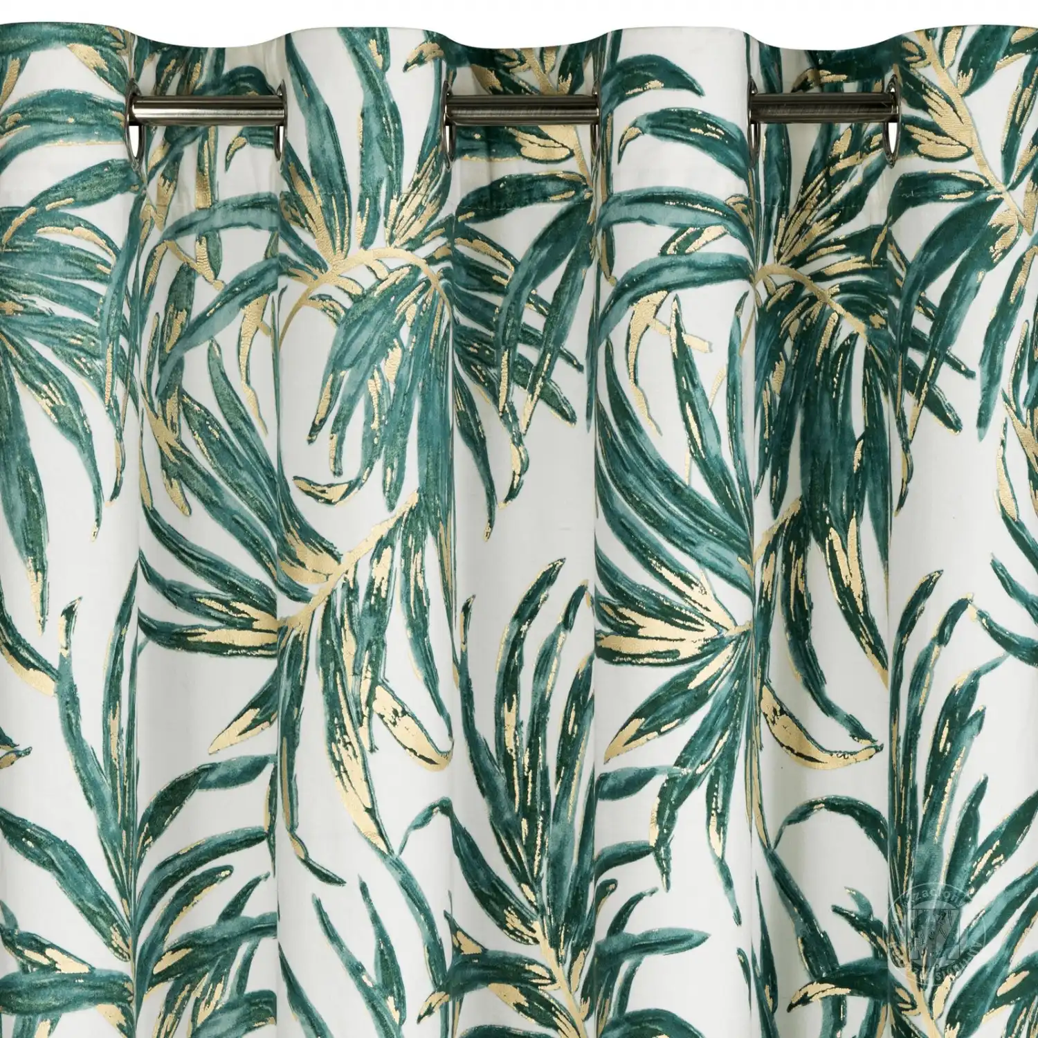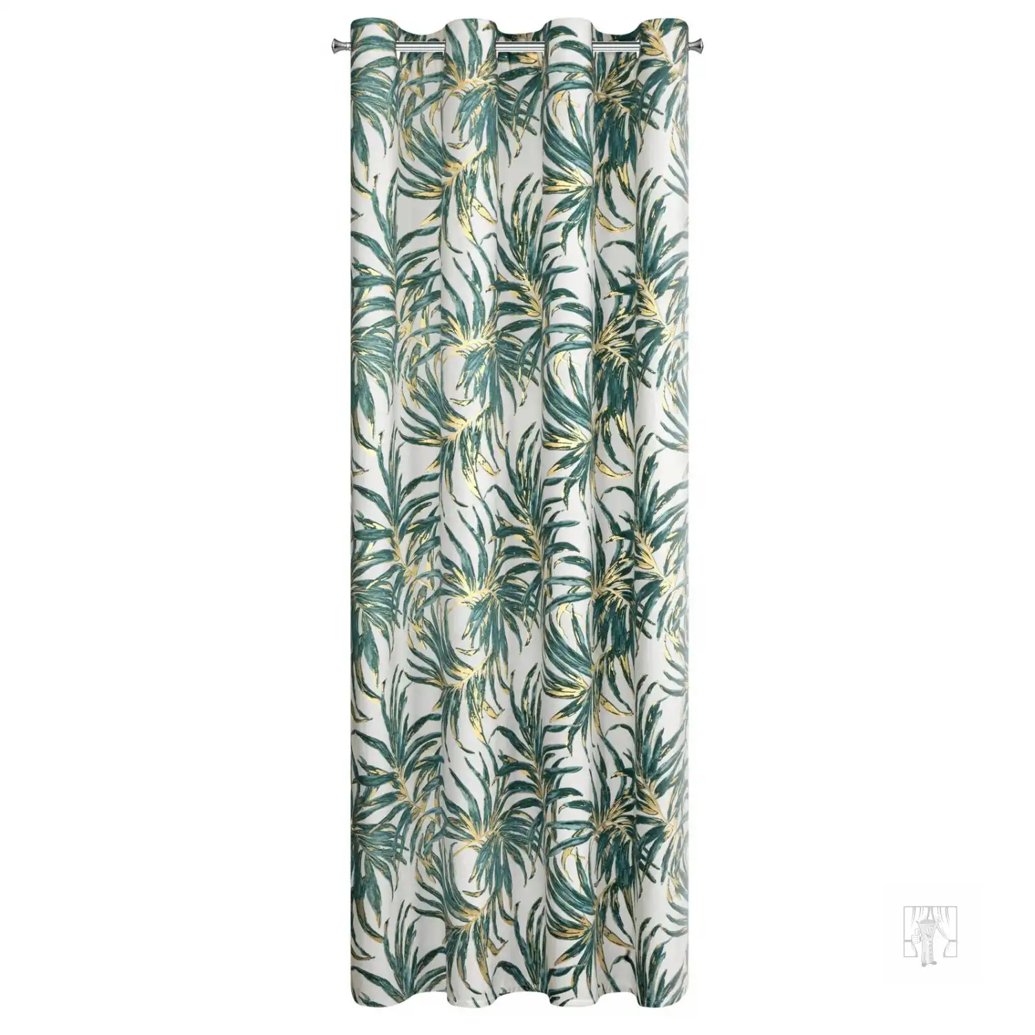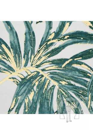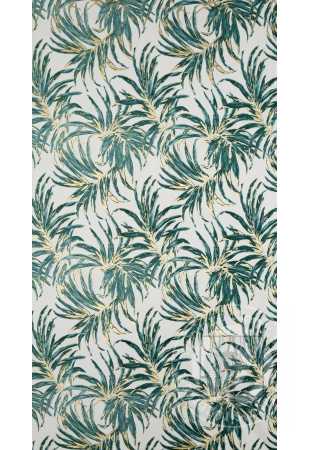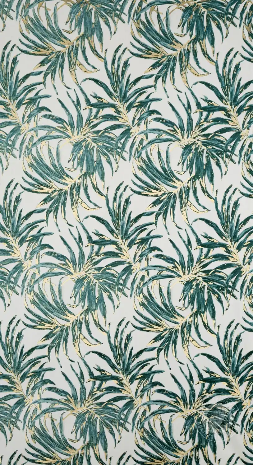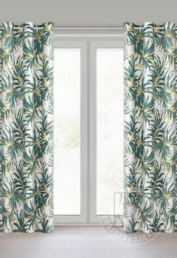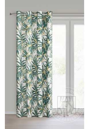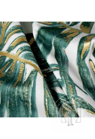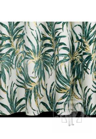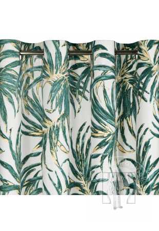 Luxusný zamatový záves obmedzuje svetlo a zaisťuje pohodlie v spálni alebo obývačke. Je zdobený výraznou potlačou exotických listov. Jeho výrazné vzory sú doplnené trblietavými zlatými kontúrami, ktoré krásne odrážajú svetlo. Praktické očká umožňujú rýchle a jednoduché zavesenie záclony a výsledný efekt je esteticky príjemný a moderný.